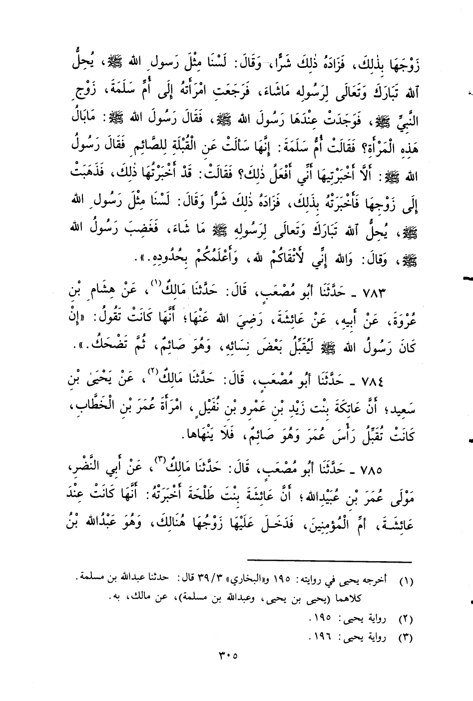 ٧٨٤ - حَدَّثَنَا أَبُو مُصْعَبٍ، قَالَ: حَدَّثَنَا مَالِكٌ، عَنْ يحْيَى بْنِ سَعِيدٍ، أَنَّ عَاتِكَةَ بْنَت زَيْدِ بْنِ عَمْرِو بْنِ نُفَيْلٍ , امْرَأَةَ عُمَرَ بْنِ الْخَطَّابِ، كَانَتْ تُقَبِّلُ رَأْسَ عُمَرَ بْنِ الْخَطَّابِ وَهُوَ صَائِمٌ , فَلَا يَنْهَاهَا.