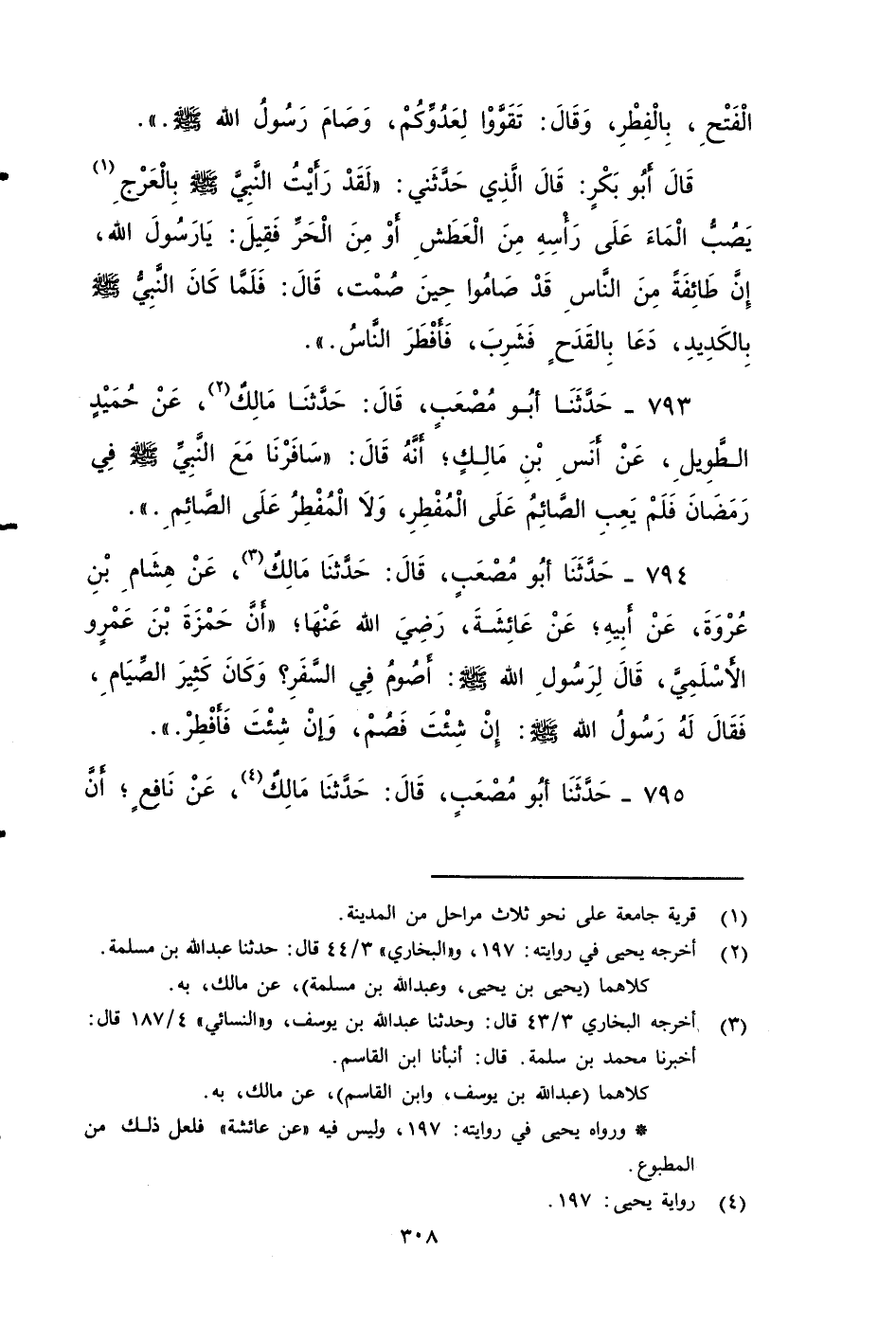 ٧٩٥ - حَدَّثَنَا أَبُو مُصْعَبٍ، قَالَ: حَدَّثَنَا مَالِكٌ، عَنْ نَافِعٍ، أَنَّ عَبْدَ اللهِ بْنَ عُمَرَ كَانَ لَا يَصُومُ فِي السَّفَرِ.