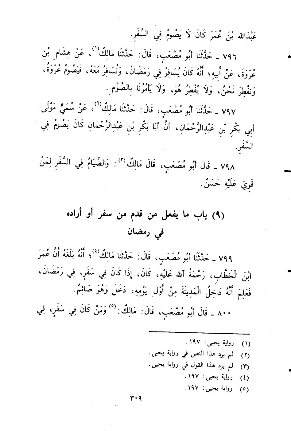 ٧٩٦ - حَدَّثَنَا أَبُو مُصْعَبٍ، قَالَ: حَدَّثَنَا مَالِكٌ، عَنْ هِشَامِ بْنِ عُرْوَةَ، عَنْ أَبِيهِ , أَنَّهُ كَانَ يُسَافِرُ فِي رَمَضَانَ، وَنُسَافِرُ مَعَهُ، فَيَصُومُ عُرْوَةُ , وَنُفْطِرُ نَحْنُ ,ولا يفطر هو, ولَا يَأْمُرُنَا بِالصِّومِ.