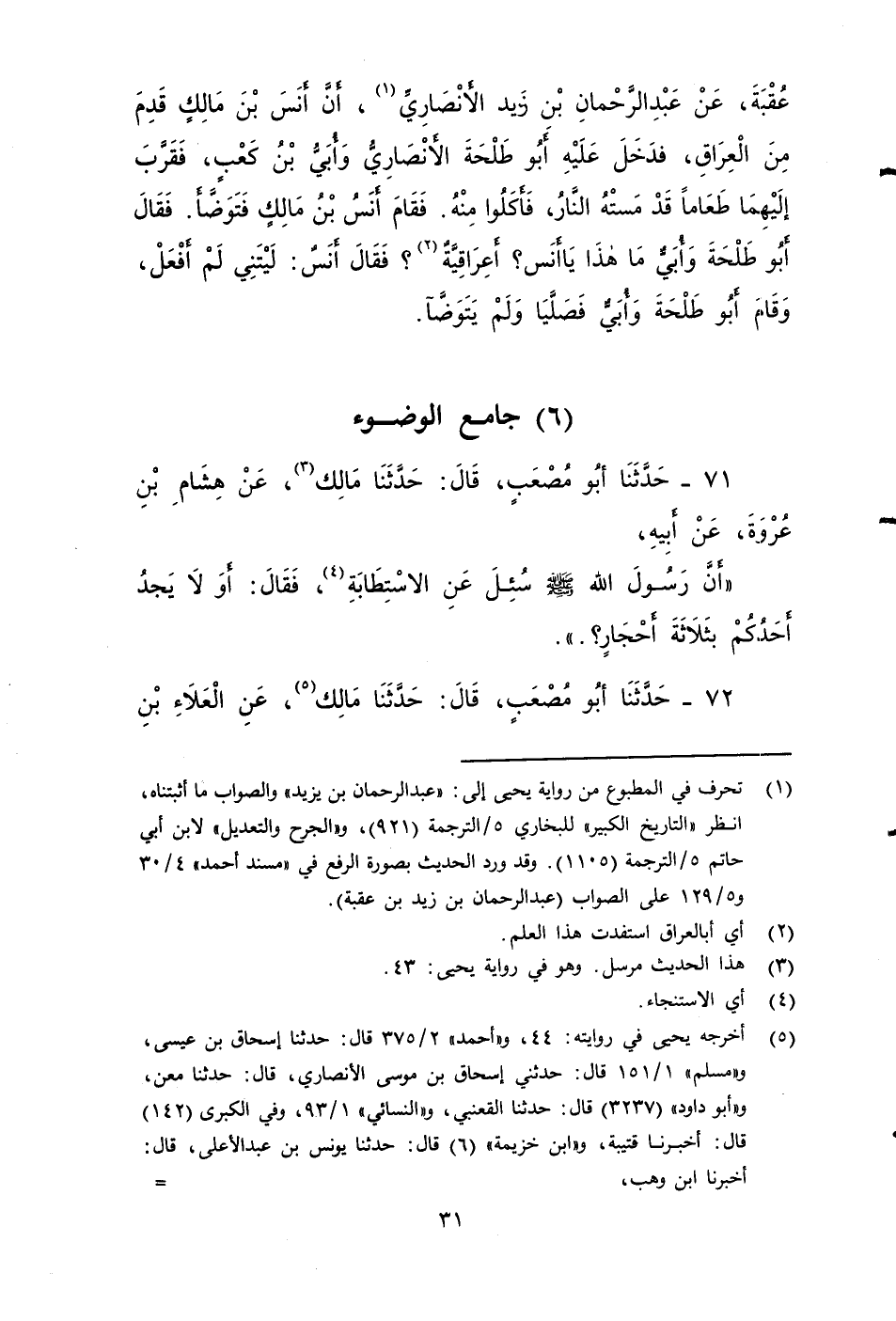٧٠ - حَدَّثَنَا أَبُو مُصْعَبٍ، قَالَ: حَدَّثَنَا مَالِكٌ، عَنْ مُوسَى بْنِ عُقْبَةَ، عَنْ عَبْدِ الرَّحْمَنِ بْنِ زَيْدٍ الأََنْصَارِيِّ، أَنَّ أَنَسَ بْنَ مَالِكٍ قَدِمَ مِنَ الْعِرَاقِ، فَدَخَلَ عَلَيْهِ أَبُو طَلْحَةَ الأََنْصَارِيِّ وَأُبَيُّ بْنُ كَعْبٍ , فَقَرَّبَ إلَيهُمَا طَعَامًا قَدْ مَسَّتْهُ النَّارُ، فَأَكَلُوا مِنْهُ، فَقَامَ أَنَسٌ بْنَ مَالِكٍ فَتَوَضَّأَ , فَقَالَ أَبُو طَلْحَةَ وَأُبَيُّ: مَا هَذَا يَا أَنَسُ أَعِرَاقِيَّةٌ؟ فَقَالَ أَنَسٌ: لَيْتَنِي لَمْ أَفْعَلْ، وَقَامَ أَبُو طَلْحَةَ وَأُبَيُّ، فَصَلَّيَا وَلَمْ يَتَوَضَّآ.