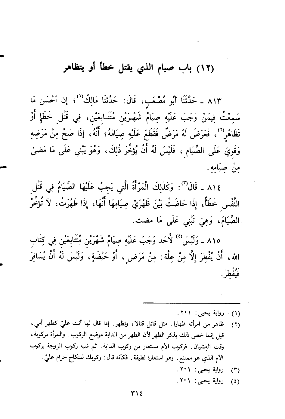 ٨١٤ - قال: وَكَذَلِكَ الْمَرْأَةُ الَّتِي يَجِبُ عَلَيْهَا الصِّيَامُ فِي قَتْلِ النَّفْسِ خَطَأً، إِذَا حَاضَتْ بَيْنَ ظَهْرَيْ صِيَامِهَا , أَنَّهَا إِذَا طَهُرَتْ، لَا تُؤَخِّرُ الصِّيَامَ، وَهِيَ تَبْنِي عَلَى مَا مَضتْ.