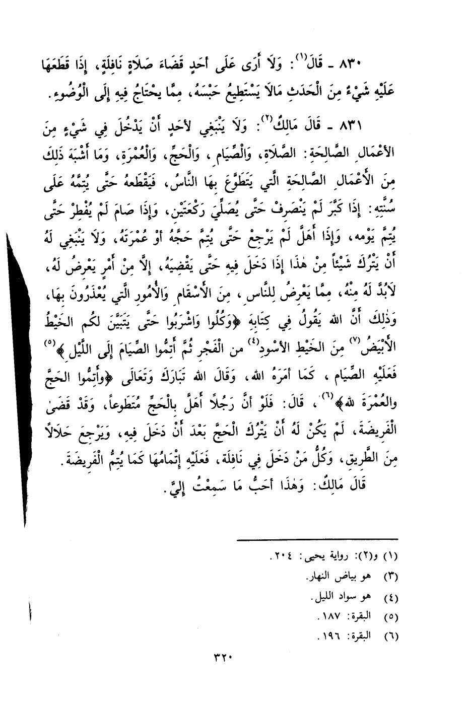 ٨٣١ - قَالَ مَالِكٌ: وَلَا يَنْبَغِي لأحد أَنْ يَدْخُلَ فِي شَيْءٍ مِنَ الأََعْمَالِ الصَّالِحَةِ: الصَّلَاةِ، وَالصِّيَامِ، وَالْحَجِّ، والعمرة وَمَا أَشْبَهَ ذَلِكَ مِنَ الأََعْمَالِ الصَّالِحَةِ الَّتِي يَتَطَوَّعُ بِهَا النَّاسُ، فَيَقْطَعَهُ حَتَّى يُتِمَّهُ عَلَى سُنَّتِهِ: إِذَا كَبَّرَ لَمْ يَنْصَرِفْ حَتَّى يُصَلِّيَ رَكْعَتَيْنِ، وَإِذَا صَامَ لَمْ يُفْطِرْ حَتَّى يُتِمَّ يَوْمِهِ، وَإِذَا أَهَلَّ لَمْ يَرْجِعْ حَتَّى يُتِمَّ حَجَّهُ أو عمرته، وَلَا يَنْبَغِي لَهُ أَنْ يَتْرُكَ شَيْئًا مِنْ هَذَا إِذَا دَخَلَ فِيهِ حَتَّى يَقْضِيَهُ، إِلَاّ مِنْ أَمْرٍ يَعْرِضُ لَهُ لابد له منه , مِمَّا يَعْرِضُ لِلنَّاسِ، مِنَ الأََسْقَامِ وَالأُمُورِ الَّتِي يُعْذَرُونَ بِهَا، وَذَلِكَ أَنَّ اللَّهَ يَقُولُ فِي كِتَابِهِ: {وَكُلُوا وَاشْرَبُوا حَتَّى يَتَبَيَّنَ لَكُمُ الْخَيْطُ الأََبْيَضُ مِنَ الْخَيْطِ الأََسْوَدِ مِنَ الْفَجْرِ ثُمَّ أَتِمُّوا الصِّيَامَ إِلَى اللَّيْلِ} فَعَلَيْهِ الصِّيَامِ، كَمَا أمره اللَّهُ، وَقَالَ اللَّهُ تبارك تَعَالَى: {وَأَتِمُّوا الْحَجَّ وَالْعُمْرَةَ لِلَّهِ} قال: فَلَوْ أَنَّ رَجُلاً أَهَلَّ بِالْحَجِّ متَطَوُّعًا وَقَدْ قَضَى الْفَرِيضَةَ، لَمْ يَكُنْ لَهُ أَنْ يَتْرُكَ الْحَجَّ بَعْدَ أَنْ دَخَلَ فِيهِ، وَيَرْجِعَ حَلَالاً مِنَ الطَّرِيقِ، وَكُلُّ من دَخَلَ فِي نَافِلَةٍ فَعَلَيْهِ إِتْمَامُهَا، كَمَا يُتِمُّ الْفَرِيضَةَ.
