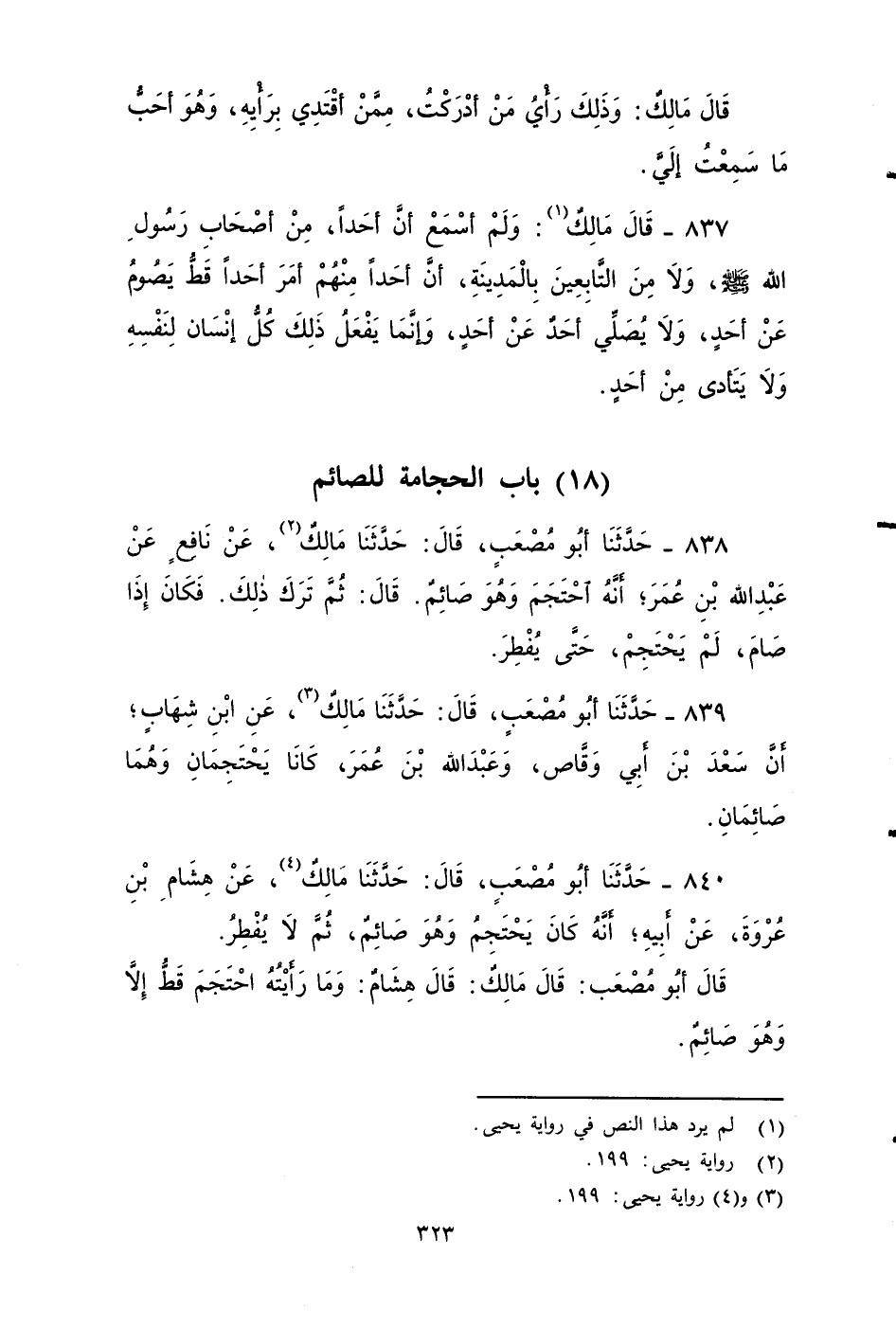 ٨٣٨ - حَدَّثَنَا أَبُو مُصْعَبٍ، قَالَ: حَدَّثَنَا مَالِكٌ، عَنْ نَافِعٍ، عَنْ عَبْدِ اللهِ بْنِ عُمَرَ؛ أَنَّهُ احْتَجِمُ وَهُوَ صَائِمٌ، قَالَ: ثُمَّ تَرَكَ ذَلِكَ، فَكَانَ إِذَا صَامَ لَمْ يَحْتَجِمْ، حَتَّى يُفْطِرَ.