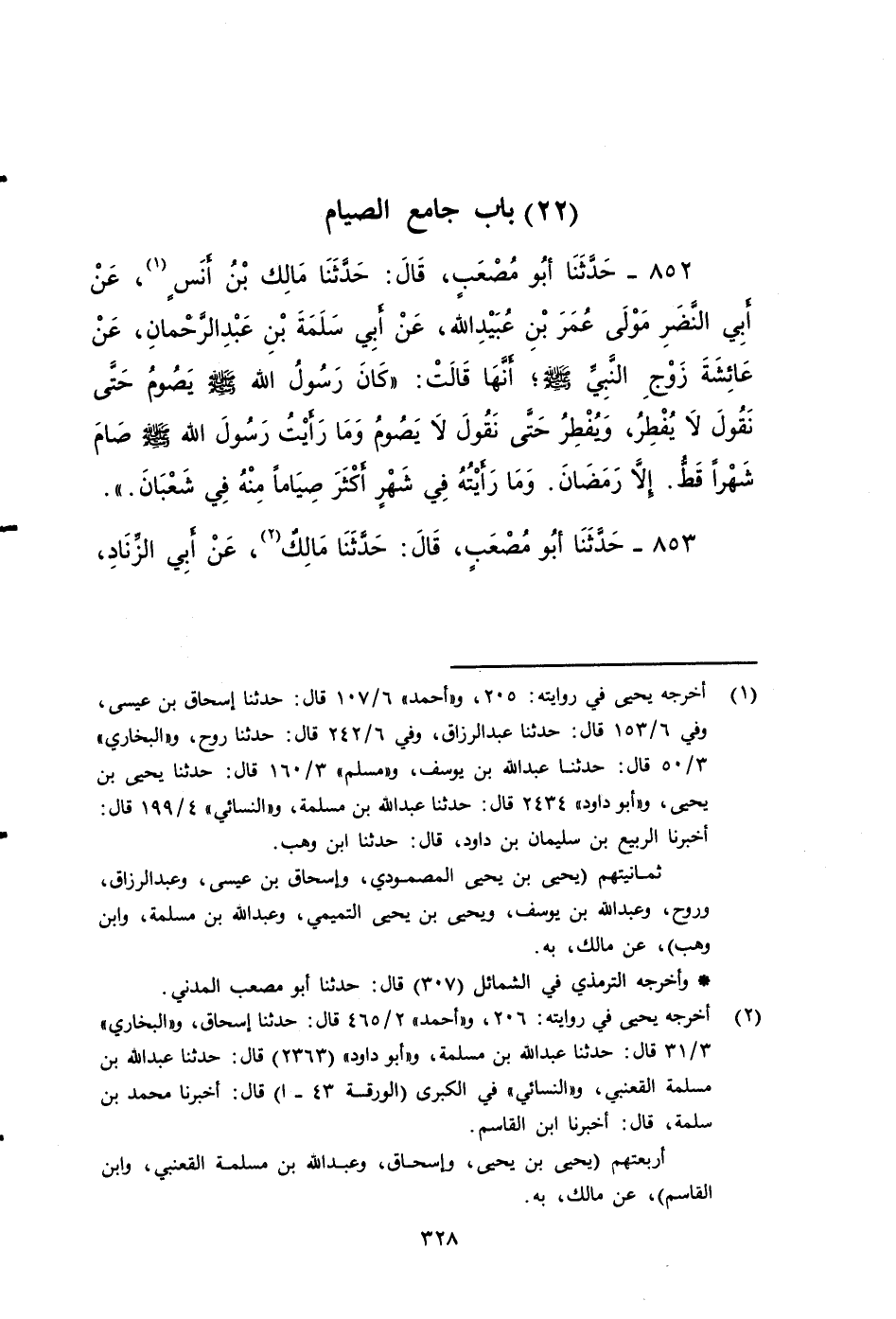 ٨٥٢ - حَدَّثَنَا أَبُو مُصْعَبٍ، قَالَ: حَدَّثَنَا مَالِكٌ بن أنس، عَنْ أَبِي النَّضْرِ مَوْلَى عُمَرَ بْنِ عُبَيْدِ اللَّهِ، عَنْ أَبِي سَلَمَةَ بْنِ عَبْدِ الرَّحْمَنِ، عَنْ عَائِشَةَ زَوْجِ النَّبِيِّ صَلى الله عَلَيه وَسَلم، أَنَّهَا قَالَتْ: كَانَ رَسُولُ اللَّهِ صَلى الله عَلَيه وَسَلم: يَصُومُ حَتَّى نَقُولَ: لا يُفْطِرُ، وَيُفْطِرُ حَتَّى نَقُولَ لا يَصُومُ، وَمَا رَأَيْتُ رَسُولَ اللَّهِ صَلى الله عَلَيه وَسَلم صامَ شَهْراً قَطُّ إِلَّا رَمَضَانَ، وَمَا رَأَيْتُهُ فِي شَهْرٍ أَكْثَرَ صِيَامًا مِنْهُ فِي شَعْبَانَ.