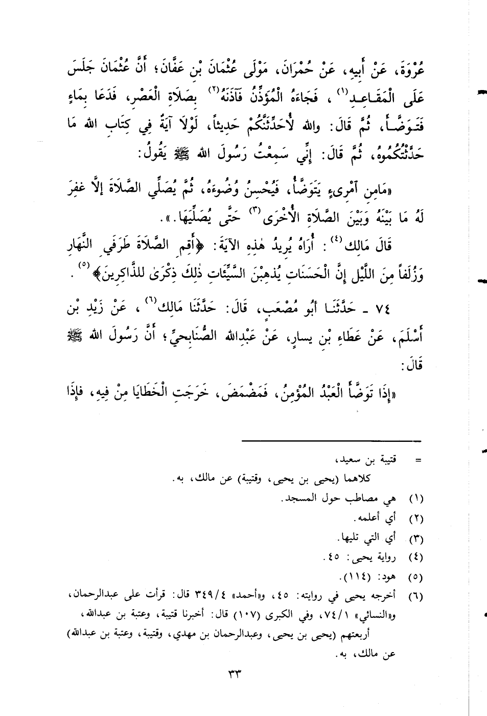 ٧٣ - حَدَّثَنَا أَبُو مُصْعَبٍ، قَالَ: حَدَّثَنَا مَالِكٌ، عَنْ هِشَامِ بْنِ عُرْوَةَ، عَنْ أَبِيهِ، عَنْ حُمْرَانَ مَوْلَى عُثْمَانَ بْنِ عَفَّانَ، أَنَّ عُثْمَانَ جَلَسَ عَلَى الْمَقَاعِدِ، فَجَاءَه الْمُؤَذِّنُ فَآذَنَهُ بِصَلَاةِ الْعَصْرِ، فَدَعَا بِمَاءٍ فَتَوَضَّأَ، ثُمَّ قَالَ: وَاللَّهِ لَأُحَدِّثَنَّكُمْ حَدِيثًا لَوْلَا آية فِي كِتَابِ اللَّهِ مَا حَدَّثْتُكُمُوهُ، ثُمَّ قَالَ: إني سَمِعْتُ رَسُولَ اللَّهِ صَلى الله عَلَيه وَسَلم، يَقُولُ: مَا مِنَ امْرِئٍ يَتَوَضَّأُ فَيُحْسِنُ وُضُوءَهُ، ثُمَّ يُصَلِّي الصَّلَاةَ، إِلَّا غُفِرَ لَهُ مَا بَيْنَهُ وَبَيْنَ الصَّلَاةِ الْأُخْرَى، حَتَّى يُصَلِّيَهَا