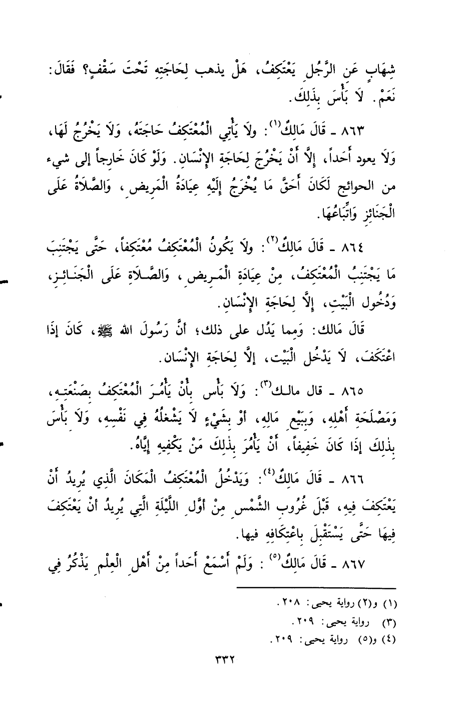 ٨٦٣ - قَالَ مَالِكٌ: ولَا يَأْتِي الْمُعْتَكِفُ حَاجَتَهُ، وَلَا يَخْرُجُ لَهَا، وَلَا يُعِود أَحَدًا، إِلَاّ أَنْ يَخْرُجَ لِحَاجَةِ الإِنْسَانِ، وَلَوْ كَانَ خَارِجًا إلى شئ من الِحَوائج، لَكَانَ أَحَقَّ مَا يُخْرَجُ إِلَيْهِ عِيَادَةُ الْمَرِيضِ، وَالصَّلَاةُ عَلَى الْجَنَائِزِ , وَاتِّبَاعُهَا.