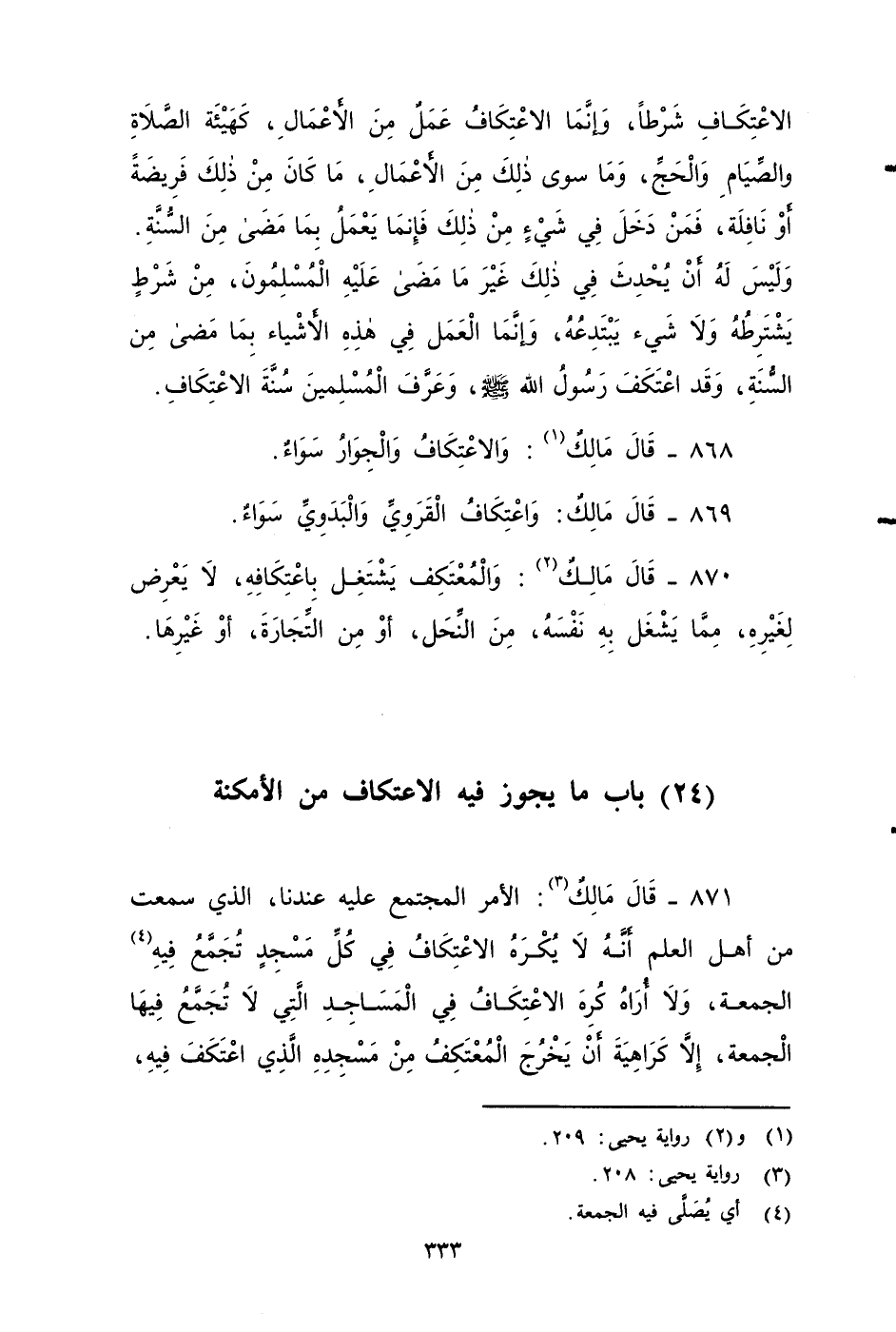 ٨٦٧ - قَالَ مَالِكٌ: ولَمْ أَسْمَعْ أَحَدًا مِنْ أَهْلِ الْعِلْمِ يَذْكُرُ فِي الاعْتِكَافِ شَرْطًا، وَإِنَّمَا الاعْتِكَافُ عَمَلٌ مِنَ الأََعْمَالِ كهيئة الصَّلَاةِ , وَالصِّيَامِ , وَالْحَجِّ، وَمَا سوى ذَلِكَ مِنَ الأََعْمَالِ، مَا كَانَ مِنْ ذَلِكَ فَرِيضَةً أَوْ نَافِلَةً، فَمَنْ دَخَلَ فِي شَيْءٍ مِنْ ذَلِكَ , فَإِنَّمَا يَعْمَلُ بِمَا مَضَى مِنَ السُّنَّةِ، وَلَيْسَ لَهُ أَنْ يُحْدِثَ فِي ذَلِكَ غَيْرَ مَا مَضَى عَلَيْهِ الْمُسْلِمُونَ، مِنْ شَرْطٍ يَشْتَرِطُهُ وَلَاشئ يَبْتَدِعُهُ، وإنما العمل في هذه الأشياء بما مضى من السنة وَقَدِ اعْتَكَفَ رَسُولُ اللهِ صَلَّى اللَّهُ عَلَيْهِ وَسَلَّمَ، وَعَرَفَ الْمُسْلِمُونَ سُنَّةَ الاِعْتِكَافِ.