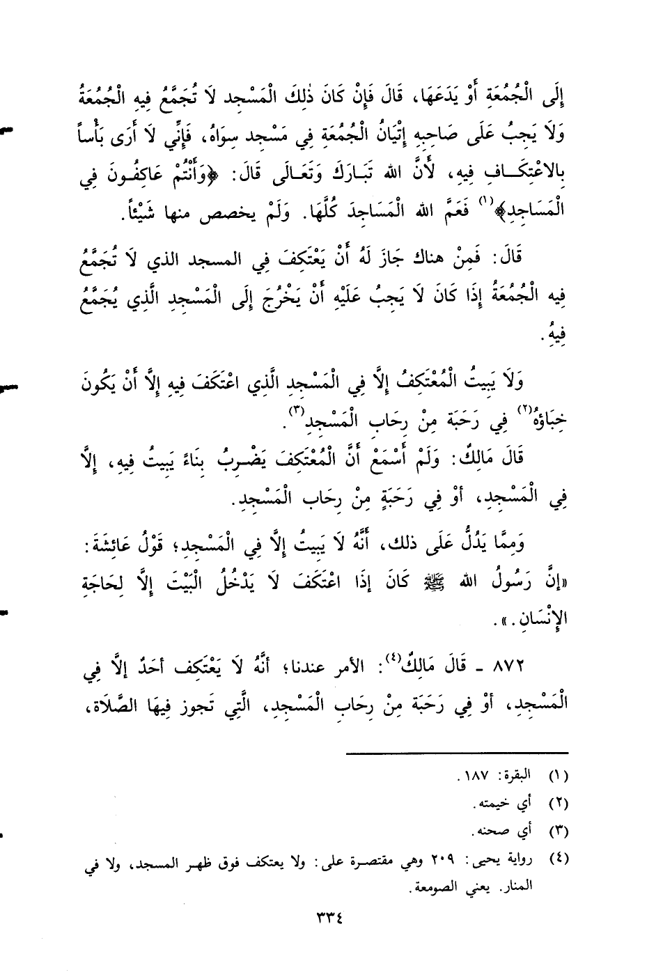 ٨٧٢ - قَالَ مَالِكٌ: الأََمْرُ عِنْدَنَا؛ أنه لايعتكف أحد إِلَاّ فِي الْمَسْجِدِ، أَوْ فِي رَحَبَةٍ مِنْ رِحَابِ الْمَسْجِدِ، الَّتِي تَجوز فِيهَا الصَّلَاة، وَلَا يَعْتَكِفُ امرؤ فَوْقَ ظَهْرِ الْمَسْجِدِ، وَلَا فِي الْمَنَارَة.