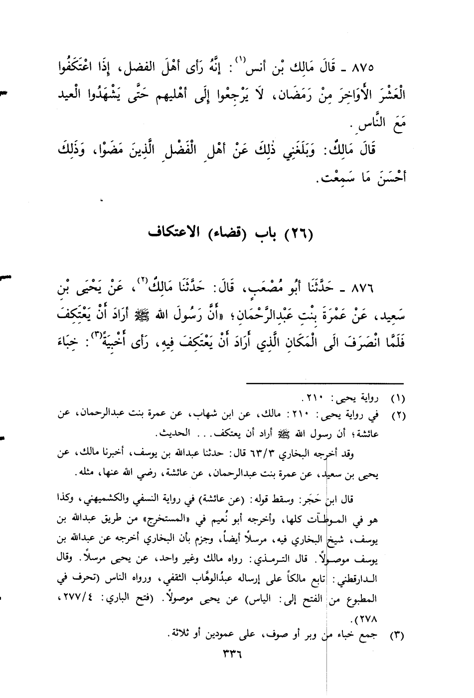 ٨٧٦ - حَدَّثَنَا أَبُو مُصْعَبٍ، قَالَ: حَدَّثَنَا مَالِكٌ، عن يحيى بن سعيد، عَنْ عَمْرَةَ بِنْتِ عَبْدِ الرَّحْمَنِ؛ أن رسول اللَّهِ صَلى الله عَلَيه وَسَلم أَرَادَ أَنْ يَعْتَكِفَ، فَلَمَّا انْصَرَفَ إِلَى الْمَكَانِ الَّذِي أَرَادَ أَنْ يَعْتَكِفَ فِيهِ رأى أَخْبِيَةً: خِبَاءَ عَائِشَةَ، وَخِبَاءَ حَفْصَةَ، وَخِبَاءَ زَيْنَبَ، فَلَمَّا رَآهَن سَأَلَ عَنْهَن، فَقِيلَ: هَذَا خِبَاءُ عَائِشَةَ، وَخِبَاءُ حَفْصَةَ، وَخِبَاءُ زَيْنَبَ فَقَالَ النبي صَلى الله عَلَيه وَسَلم: آلْبِرَّ تَقُولُونَ بِهِنَّ؟ ثُمَّ انْصَرَفَ، فَلَمْ يَعْتَكِفْ حَتَّى اعْتَكَفَ عَشْرًا مِنْ شَوَّالٍ.