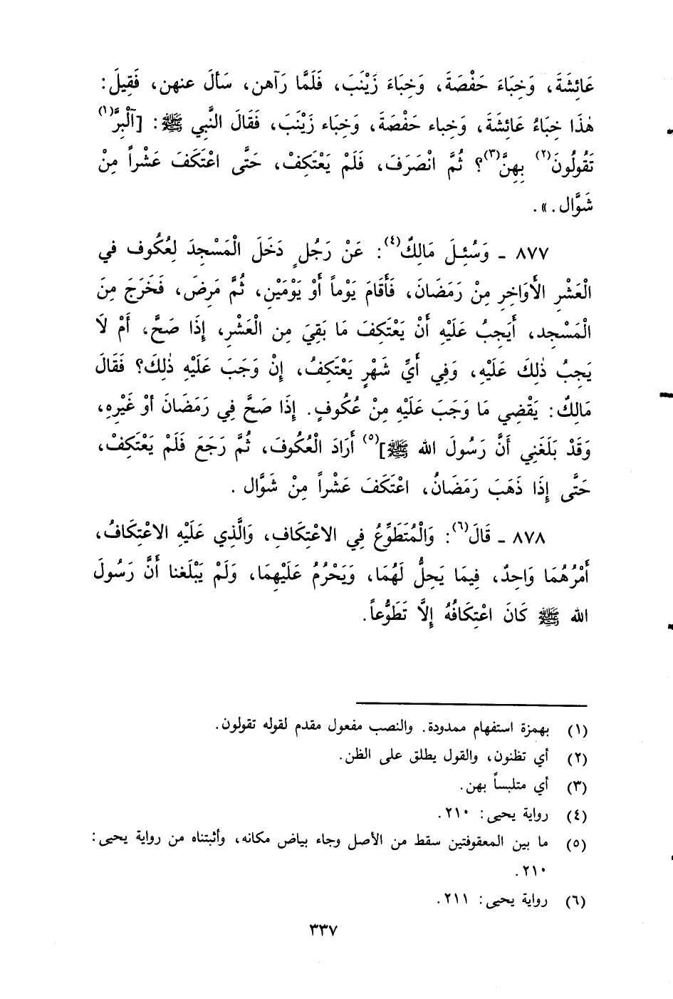 ٨٧٧ - وَسُئِلَ مَالِكٌ: عَنْ رَجُلٍ دَخَلَ الْمَسْجِدَ لِعُكُوفٍ فِي الْعَشْرِ الأََوَاخِرِ مِنْ رَمَضَانَ، فَأَقَامَ يَوْمًا أَوْ يَوْمَيْنِ، ثُمَّ مَرِضَ فَخَرَجَ مِنَ الْمَسْجِدِ، أَيَجِبُ عَلَيْهِ أَنْ يَعْتَكِفَ مَا بَقِيَ مِنَ الْعَشْرِ إِذَا صَحَّ , أَمْ لَا يَجِبُ ذَلِكَ عَلَيْهِ؟ وَفِي أَيِّ شَهْرٍ يَعْتَكِفُ إِنْ وَجَبَ عَلَيْهِ ذَلِكَ؟ فَقَالَ مَالِكٌ: يَقْضِي مَا وَجَبَ عَلَيْهِ مِنْ عُكُوفٍ , إِذَا صَحَّ فِي رَمَضَانَ أَوْ غَيْرِهِ، وَقَدْ بَلَغَنِي أَنَّ رَسُولَ اللهِ صَلَّى اللَّهُ عَلَيْهِ وَسَلَّمَ أَرَادَ الْعُكُوفَ ثُمَّ رَجَعَ , فَلَمْ يَعْتَكِفْ , حَتَّى إِذَا ذَهَبَ رَمَضَانُ اعْتَكَفَ عَشْرًا مِنْ شَوَّالٍ.