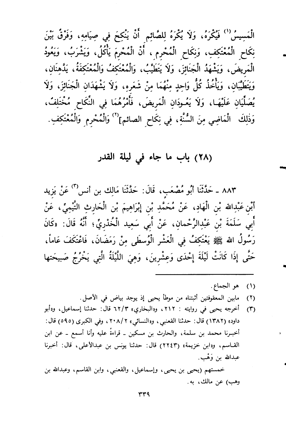 ٨٨٣ - حَدَّثَنَا أَبُو مُصْعَبٍ، قَالَ: حَدَّثَنَا مَالِكٌ بن أنس، عَنْ يَزِيدَ بْنِ عَبْدِ اللَّهِ بْنِ الْهَادِ، عَنْ مُحَمَّدِ بْنِ إِبْرَاهِيمَ بْنِ الْحَارِثِ التَّيْمِيِّ، عَنْ أَبِي سَلَمَةَ بْنِ عَبْدِ الرَّحْمَنِ، عَنْ أَبِي سَعِيدٍ الْخُدْرِيِّ، أَنَّهُ قَالَ: كَانَ رَسُولُ اللَّهِ صَلى الله عَلَيه وَسَلم: يَعْتَكِفُ الْعَشْرَ الْوُسُطَى مِنْ رَمَضَانَ، فَاعْتَكَفَ عَامًا حَتَّى إِذَا كَانَت لَيْلَةَ إِحْدَى وَعِشْرِينَ، وَهِيَ اللَّيْلَةُ الَّتِي يَخْرُجُ صبيحتها مِنَ اعْتِكَافِهِ، فقَالَ: مَنْ كان اعْتَكَفَ مَعِيَ فَلْيَعْتَكِفِ الْعَشْرَ الأَوَاخِرَ، وَقَدْ رَأَيْتُ هَذِهِ اللَّيْلَةَ، ثُمَّ أُنْسِيتُهَا، وَقَدْ رَأَيْتُنِي أَسْجُدُ في صَبِيحَتهَا فِي مَاءٍ وَطِينٍ، فَالْتَمِسُوهَا فِي الْعَشْرِ الأَوَاخِرِ، وَالْتَمِسُوهَا فِي كُلِّ وِتْرٍ، قَالَ أَبُو سَعِيدٍ: فَأُمْطِرَتِ السَّمَاءُ تِلْكَ اللَّيْلَةَ، وَكَانَ الْمَسْجِدُ عَلَى عَرِيشٍ، فَوَكَفَ الْمَسْجِدُ، قَالَ أَبُو سَعِيدٍ: فَأَبْصَرَتْ عَيْنَايَ رَسُولَ اللَّهِ صَلى الله عَلَيه وَسَلم انْصَرَفَ إلينا وَعَلَى جَبْهَتِهِ، وَأَنْفِهِ أَثَرُ الْمَاءِ، وَالطِّينِ مِنْ صُبْيحِة إِحْدَى وَعِشْرِينَ.