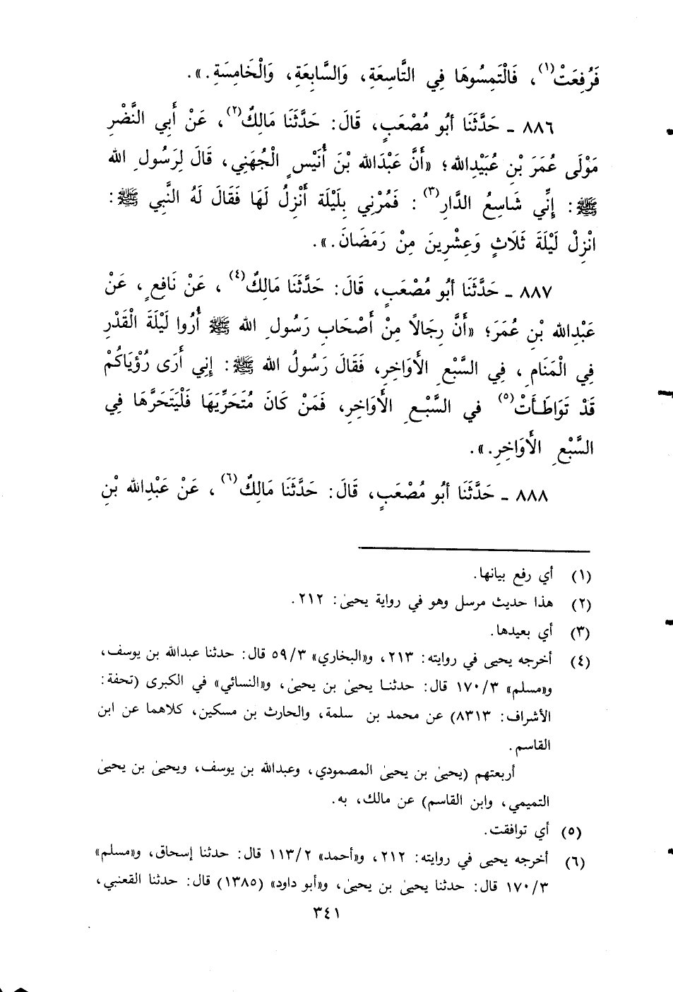 ٨٨٧ - حَدَّثَنَا أَبُو مُصْعَبٍ، قَالَ: حَدَّثَنَا مَالِكٌ، عَنْ نَافِعٍ، عَنْ عبد الله بْنِ عُمَرَ، أَنَّ رِجَالًا مِنْ أَصْحَابِ رَسُولِ اللَّهِ صَلى الله عَلَيه وَسَلم: أُرُوا لَيْلَةَ الْقَدْرِ فِي الْمَنَامِ، فِي السَّبْعِ الأَوَاخِرِ، فَقَالَ رَسُولُ اللَّهِ صَلى الله عَلَيه وَسَلم: إِنِّي أَرَى رُؤْيَاكُمْ قَدْ تَوَاطَأَتْ فِي السَّبْعِ الأَوَاخِرِ، فَمَنْ كَانَ مُتَحَرِّيَهَا: فَلْيَتَحَرَّهَا فِي السَّبْعِ الأَوَاخِرِ.