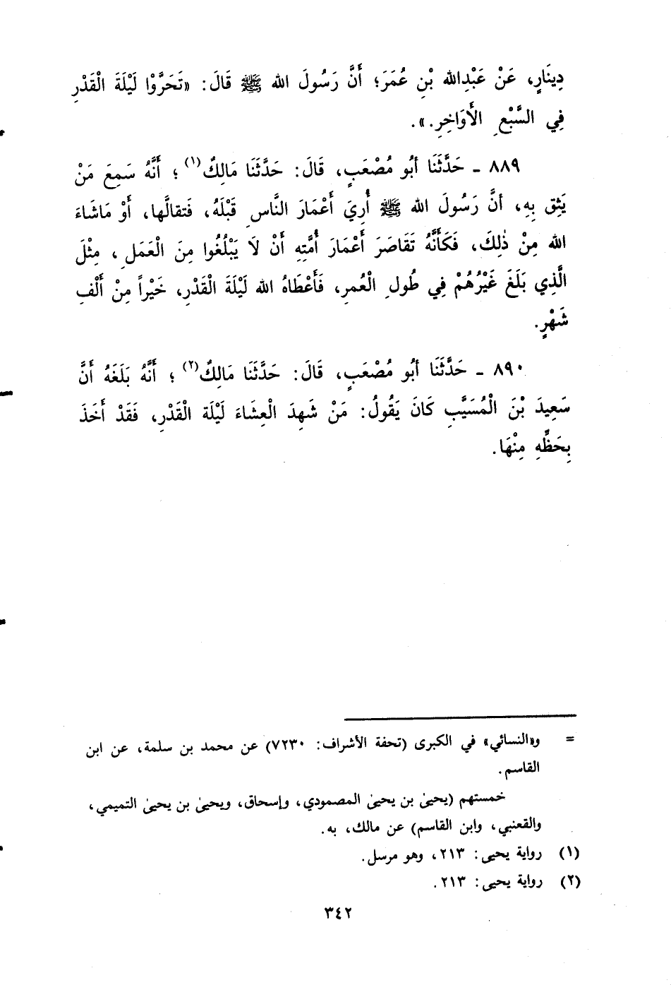 ٨٩٠ - حَدَّثَنَا أَبُو مُصْعَبٍ، قَالَ: حَدَّثَنَا مَالِكٌ؛ أَنَّهُ بَلَغَهُ , أَنَّ سَعِيدَ بْنَ الْمُسَيَّبِ كَانَ يَقُولُ: مَنْ شَهِدَ الْعِشَاءَ لَيْلَةِ الْقَدْرِ، فَقَدْ أَخَذَ بِحَظِّهِ مِنْهَا.