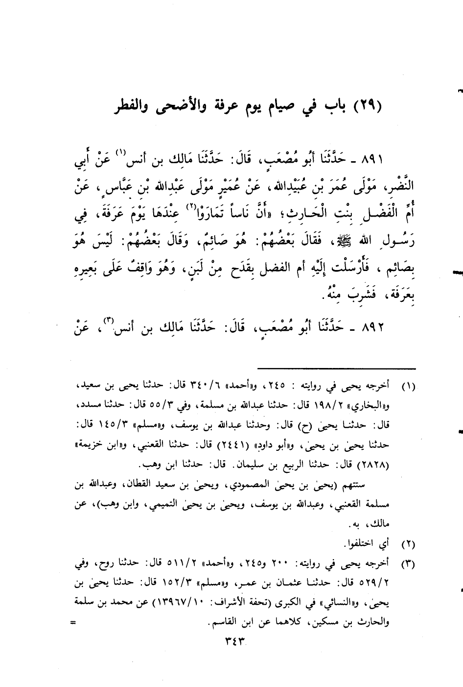 ٨٩١ - حَدَّثَنَا أَبُو مُصْعَبٍ، قَالَ: حَدَّثَنَا مَالِكٌ بن أنس، عَنْ أَبِي النَّضْرِ مَوْلَى عُمَرَ بْنِ عُبَيْدِ اللَّهِ، عَنْ عُمَيْرٍ مَوْلَى عَبْدِ اللَّهِ بْنِ عَبَّاسٍ، عَنْ أُمِّ الْفَضْلِ بِنْتِ الْحَارِثِ، أَنَّ نَاسًا تَمَارَوْا عِنْدَهَا يَوْمَ عَرَفَةَ، فِي رَسُولِ اللَّهِ صَلى الله عَلَيه وَسَلم، فَقَالَ بَعْضُهُمْ: هُوَ صَائِمٌ، وَقَالَ بَعْضُهُمْ: لَيْسَ هو بِصَائِمٍ، فَأَرْسَلَتْ إِلَيْهِ أم الفضل بِقَدَحِ لَبَنٍ، وَهُوَ وَاقِفٌ عَلَى بَعِيرِهِ بعرفة، فَشَرِبَ منه.