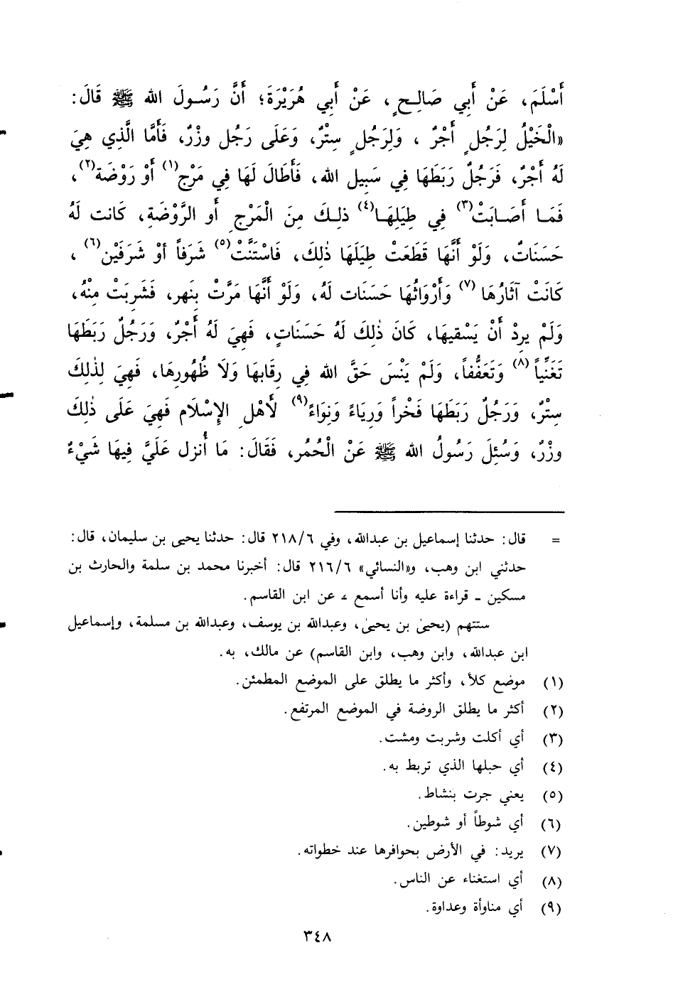 ٩٠١ - حَدَّثَنَا أَبُو مُصْعَبٍ، قَالَ: حَدَّثَنَا مَالِكٌ، عَنْ زَيْدِ بْنِ أَسْلَمَ، عَنْ أَبِي صَالِحٍ السَّمَّانِ، عَنْ أَبِي هُرَيْرَةَ، أن رسول اللَّهِ صَلى الله عَلَيه وَسَلم، قَالَ: الْخَيْلُ لِرَجُلٍ أَجْرٌ، وَلِرَجُلٍ سِتْرٌ، وَعَلَى رَجُلٍ وِزْرٌ، فَأَمَّا الَّذِي هِيَ لَهُ أَجْرٌ: فَرَجُلٌ رَبَطَهَا فِي سَبِيلِ اللَّهِ، فَأَطَالَ لَهَا فِي مَرْجٍ، أَوْ رَوْضَةٍ، فَمَا أَصَابَتْ فِي طِيَلِهَا ذَلِكَ مِنَ الْمَرْجِ، أَوِ الرَّوْضَةِ كَانَت لَهُ حَسَنَاتٌ، وَلَوْ أَنَّهَا قُطِعَتْ طِيَلَهَا ذَلِكَ، فَاسْتَنَّتْ شَرَفًا، أَوْ شَرَفَيْنِ كَانَتْ آثَارُهَا، وَأَرْوَاثُهَا حَسَنَاتٍ لَهُ، وَلَوْ أَنَّهَا مَرَّتْ بِنَهَرٍ، فَشَرِبَتْ مِنْهُ، وَلَمْ يُرِدْ أَنْ يَسْقِيَها كَانَ ذَلِكَ لَهُ حَسَنَاتٍ، فَهِيَ لَهُ أَجْرٌ، وَرَجُلٌ رَبَطَهَا تَغَنِّيًا، وَتَعَفُّفًا، وَلَمْ يَنْسَ حَقَّ اللَّهِ فِي رِقَابِهَا، وَلَا فِي ظُهُورِهَا فَهِيَ لِذَلِكَ سِتْرٌ، وَرَجُلٌ رَبَطَهَا فَخْرًا، وَرِيَاءً، وَنِوَاءً لِأَهْلِ الْإِسْلَامِ فَهِيَ عَلَى ذَلِكَ وِزْرٌ، وَسُئِلَ رَسُولُ اللَّهِ صَلى الله عَلَيه وَسَلم، عَنِ الْحُمُرِ، فَقَالَ: مَا أُنْزِلَ عَلَيَّ فِيهَا شَيْءٌ إِلَّا هَذِهِ الْآيَةُ الْجَامِعَةُ الْفَاذَّةُ: {فَمَنْ يَعْمَلْ مِثْقَالَ ذَرَّةٍ خَيْرًا يَرَهُ، وَمَنْ يَعْمَلْ مِثْقَالَ ذَرَّةٍ شَرًّا يَرَهُ} .
