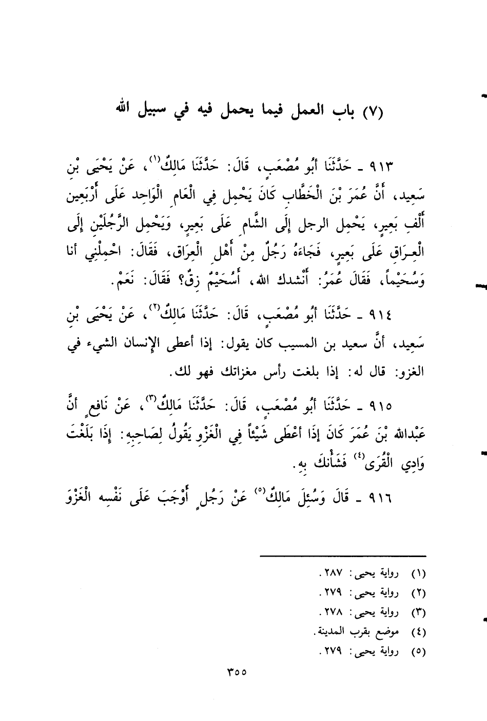 ٩١٤ - حَدَّثَنَا أَبُو مُصْعَبٍ، قَالَ: حَدَّثَنَا مَالِكٌ، عَنْ يَحْيَى بْنِ سَعِيدٍ، أَنَّ سَعِيدَ بْنَ الْمُسَيَّبِ كَانَ يَقُولُ: إِذَا أُعْطِيَ الإنسان الشَّيْءَ فِي الْغَزْوِ، قال له: إذابَلَغَت رَأْسَ مَغْزَاتِك، فَهُوَ لَك.
