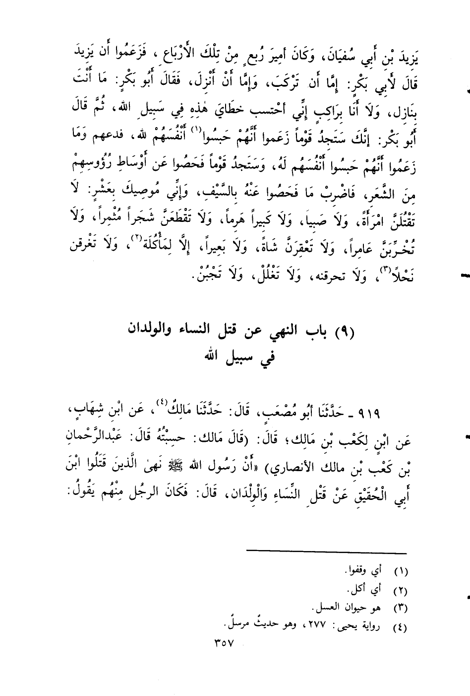 ٩١٨ - حَدَّثَنَا أَبُو مُصْعَبٍ، قَالَ: حَدَّثَنَا مَالِكٌ، عَنْ يَحْيَى بْنِ سَعِيدٍ، أَنَّ أَبَا بَكْرٍ الصِّدِّيقَ بَعَثَ جُيُوشًا إِلَى الشَّامِ، فَخَرَجَ يَمْشِي مَعَ يَزِيدَ بْنِ أَبِي سُفْيَانَ , وَكَانَ أَمِيرَ رُبْعٍ مِنْ تِلْكَ الأََرْبَاعِ، فَزَعَمُوا أَنَّ يَزِيدَ قَالَ لأَبِي بَكْرٍ: إِمَّا أَنْ تَرْكَبَ، وَإِمَّا أَنْ أَنْزِلَ، فَقَالَ أَبُو بَكْرٍ: مَا أَنْتَ بِنَازِلٍ، وَمَا أَنَا بِرَاكِبٍ، إِنِّي أَحْتَسِبُ خُطَايَ هَذِهِ فِي سَبِيلِ اللهِ، ثُمَّ قَالَ أَبُو بَكْرٍ: إِنَّكَ سَتَجِدُ قَوْمًا زَعَمُوا أَنَّهُمْ حَبَّسُوا أَنْفُسَهُمْ لِلَّهِ، فَدعهُمْ وَمَا زَعَمُوا أَنَّهُمْ حَبَّسُوا أَنْفُسَهُمْ لَهُ، وَسَتَجِدُ قَوْمًا فَحَصُوا عَنْ أَوْسَاطِ رُؤُوسِهِمْ مِنَ الشَّعَرِ، فَاضْرِبْ مَا فَحَصُوا عَنْهُ بِالسَّيْفِ، وَإِنِّي مُوصِيكَ بِعَشْرٍ: لَا تَقْتُلَنَّ امْرَأَةً، وَلَا صَبِيًّا، وَلَا كَبِيرًا هَرِمًا، وَلَا تَقْطَعَنَّ شَجَرًا مُثْمِرًا، وَلَا تُخَرِّبَنَّ عَامِرًا، وَلَا تَعْقِرَنَّ شَاةً، وَلَا بَعِيرًا، إِلَاّ لِمَأْكَلَةٍ، وَلَا تُغَرِّقَنَّ نَحْلاً وَلَا تَحْرِقَنَّه، وَلَا تَغْلُلْ , وَلَا تَجْبُنْ.