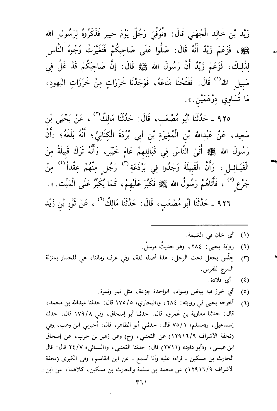 ٩٢٦ - حَدَّثَنَا أَبُو مُصْعَبٍ، قَالَ: حَدَّثَنَا مَالِكٌ، عَنْ ثَوْرِ بْنِ زَيْدٍ الدِّيلِيِّ، عَنْ أَبِي الْغَيْثِ سَالِمٍ مَوْلَى ابْنِ مُطِيعٍ، عَنْ أَبِي هُرَيْرَةَ، أنه قَالَ: خَرَجْنَا مَعَ رَسُولِ اللَّهِ صَلى الله عَلَيه وَسَلم عَامَ خيبر، فَلَمْ نَغْنَمْ ذَهَبًا، وَلَا فضة، إِلَّا الأَمْوَالَ والثِّيَابَ، وَالْمَتَاعَ، قَالَ: فوجه رسول الله صَلى الله عَلَيه وَسَلم نحو وادي القرى، وكان رِفَاعَةُ بْنُ زَيْدٍ وَهَبَ لِرَسُولِ اللَّهِ صَلى الله عَلَيه وَسَلم عبدًا أَسْوَدَ، يُقَالُ لَهُ: مِدْعَمٌ، فَوَجَّهَ رَسُولُ اللَّهِ صَلى الله عَلَيه وَسَلم إِلَى وَادِي الْقُرَى فخرجنا حَتَّى إِذَا كُنَّا بِوَادِي الْقُرَى، فبَيْنَمَا مِدْعَمٌ، يَحُطُّ رَحْلَ رَسُولِ اللَّهِ صَلى الله عَلَيه وَسَلم: إِذْ جَاءَهُ سَهْمٌ عَائِرٌ، فَأَصَابَهُ، فَقَتَلَهُ، فَقَالَ النَّاسُ: هَنِيئًا لَهُ الْجَنَّةُ، فَقَالَ رَسُولُ اللَّهِ صَلى الله عَلَيه وَسَلم: كَلَّا وَالَّذِي نَفْسِي بِيَدِهِ، إِنَّ الشَّمْلَةَ الَّتِي أَخَذَها يَوْمَ خَيْبَرَ مِنَ الْمَغَانِمِ، لَمْ تُصِبْهَا الْمَقَاسِمُ تَشْتَعِلُ عَلَيْهِ نَارًا، فَلَمَّا سَمِعَ ذَلِكَ النَّاسُ جَاءَ رَجُلٌ بِشِرَاكٍ، أَوْ بشِرَاكَيْنِ إِلَى رَسُولِ اللَّهِ صَلى الله عَلَيه وَسَلم، فَقَالَ رَسُولُ اللَّهِ صَلى الله عَلَيه وَسَلم: شِرَاكٌ أَوْ شِرَاكَانِ مِنْ نَارٍ.