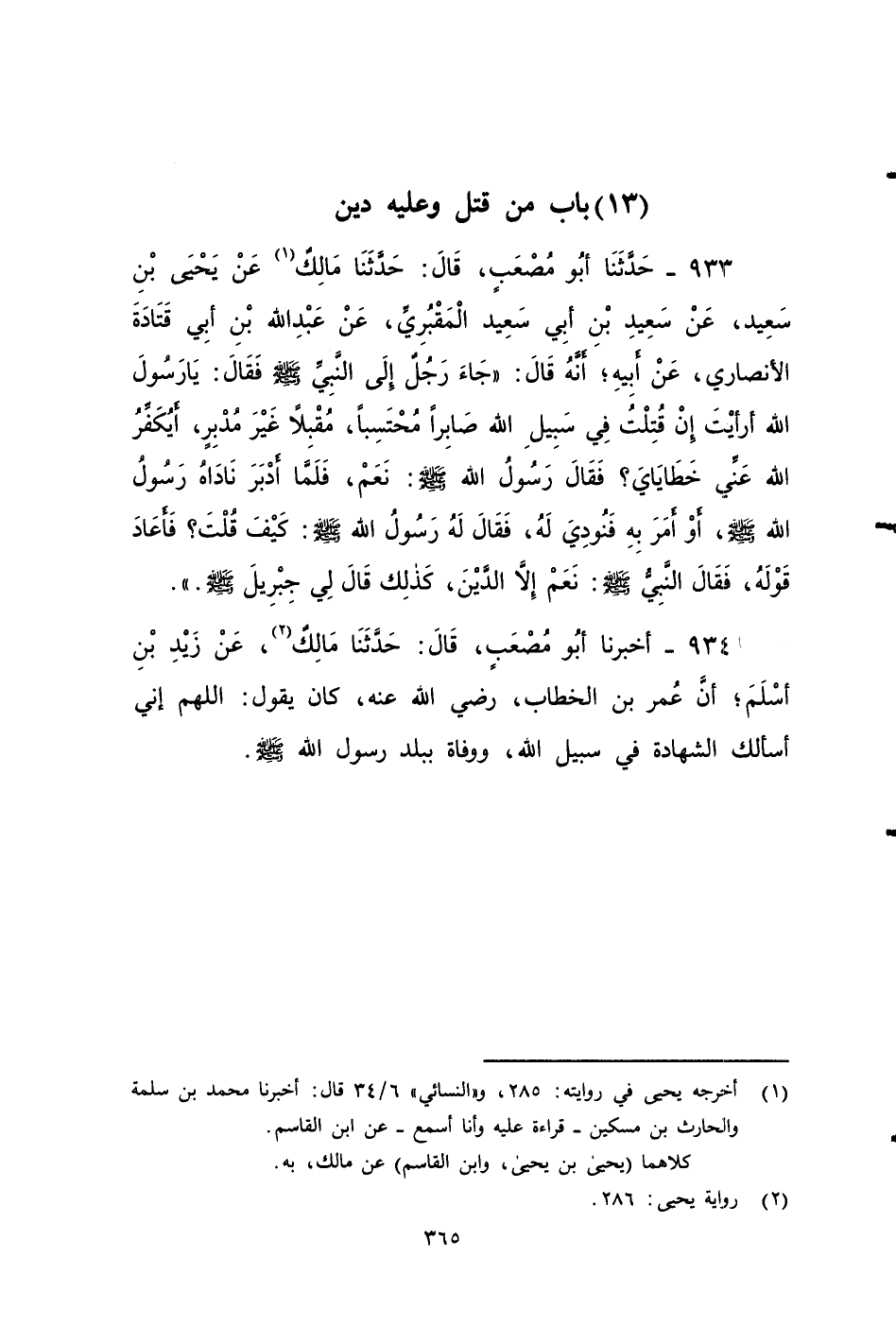 ٩٣٣ - حَدَّثَنَا أَبُو مُصْعَبٍ، قَالَ: حَدَّثَنَا مَالِكٌ، عَنْ يَحْيَى بْنِ سَعِيدٍ، عَنْ سَعِيدِ بْنِ أَبِي سَعِيدٍ الْمَقْبُرِيِّ، عَنْ عَبْدِ اللَّهِ بْنِ أَبِي قَتَادَةَ الأنصاري، عَنْ أَبِيهِ، أَنَّهُ قَالَ: جَاءَ رَجُلٌ إِلَى النبي صَلى الله عَلَيه وَسَلم، فَقَالَ: يَا رَسُولَ اللَّهِ، أرأيت إِنْ قُتِلْتُ فِي سَبِيلِ اللَّهِ صَابِرًا مُحْتَسِبًا، مُقْبِلًا غَيْرَ مُدْبِرٍ، أَيُكَفِّرُ اللَّهُ عَنِّي خَطَايَايَ؟ فَقَالَ رَسُولُ اللَّهِ صَلى الله عَلَيه وَسَلم: نَعَمْ، فَلَمَّا أَدْبَرَ، نَادَاهُ رَسُولُ اللَّهِ صَلى الله عَلَيه وَسَلم، أَوْ أَمَرَ بِهِ، فَنُودِيَ لَهُ، فَقَالَ لَهُ رَسُولُ اللَّهِ صَلى الله عَلَيه وَسَلم: كَيْفَ قُلْتَ؟ فَأَعَادَ عَلَيْهِ قَوْلَهُ، فَقَالَ النَّبِيُّ صَلى الله عَلَيه وَسَلم: نَعَمْ، إِلَّا الدَّيْنَ، كَذَلِكَ قَالَ لِي جِبْرِيلُ صَلى الله عَلَيه وَسَلم.