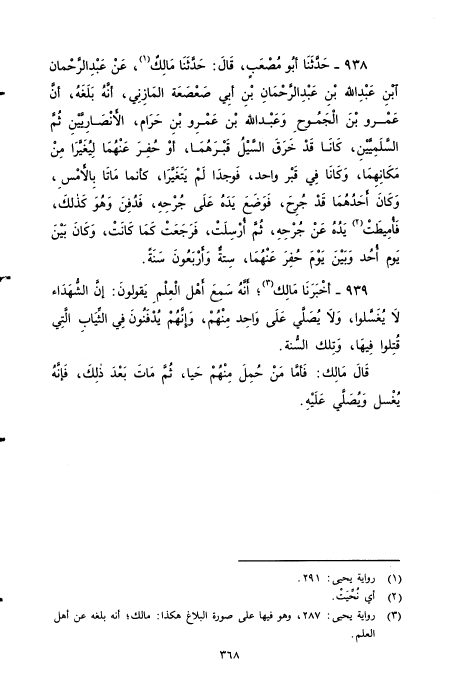 ٩٣٨ - حَدَّثَنَا أَبُو مُصْعَبٍ، قَالَ: حَدَّثَنَا مَالِكٌ، عَنْ عَبْدِ الرَّحْمَنِ بن عبد الله بن عَبْدِ الرَّحْمَنِ بن أَبِي صَعْصَعَةَ المازني، أَنَّهُ بَلَغَهُ , أَنَّ عَمْرَو بْنَ الْجَمُوحِ , وَعَبْدَ اللهِ بْنَ عَمْرٍو بن حرام الأََنْصَارِيَّيْنِ , ثُمَّ السَّلَمِيَّيْنِ , كَانَا قَدْ خرق السَّيْلُ قَبْرَهُمَا أوحَفَرَ عنهما، لِيُغَيَّرَا مِنْ مَكَانِهِمَا وَكَانَا فِي قَبْرٍ وَاحِدٍ فَوُجِدَا لَمْ يَتَغَيَّرَا، كَأَنَّمَا مَاتَا بِالأََمْسِ، وَكَانَ أَحَدُهُمَا قَدْ جُرِحَ , فَوَضَعَ يَدَهُ عَلَى جُرْحِهِ، فَدُفِنَ وَهُوَ كَذَلِكَ، فَأُمِيطَتْ يَدُهُ عَنْ جُرْحِهِ، ثُمَّ أُرْسِلَتْ فَرَجَعَتْ كَمَا كَانَتْ، وَكَانَ بَيْنَ أُحُدٍ، وَبَيْنَ يَوْمَ حُفِرَ عَنْهُمَا , سِتٌّ وَأَرْبَعُونَ سَنَةً.