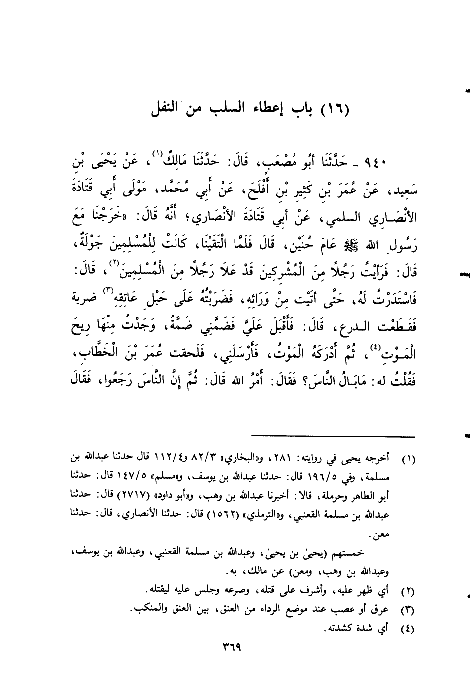 ٩٤٠ - حَدَّثَنَا أَبُو مُصْعَبٍ، قَالَ: حَدَّثَنَا مَالِكٌ، عَنْ يَحْيَى بْنِ سَعِيدٍ، عَنْ عُمَرَ بْنِ كَثِيرِ بْنِ أَفْلَحَ، عَنْ أَبِي مُحَمَّدٍ مَوْلَى أَبِي قَتَادَةَ الأَنْصَارِيِّ السُّلَمِيِّ، عَنْ أَبِي قَتَادَةَ الأَنْصَارِيِّ، أَنَّهُ قَالَ: خَرَجْنَا مَعَ رَسُولِ اللَّهِ صَلى الله عَلَيه وَسَلم عَامَ حُنَيْنٍ، قَالَ: فَلَمَّا الْتَقَيْنَا كَانَتْ لِلْمُسْلِمِينَ جَوْلَةٌ، قَالَ: فَرَأَيْتُ رَجُلًا مِنَ الْمُشْرِكِينَ، قَدْ عَلا رَجُلا مِنَ الْمُسْلِمِينَ، قَالَ: فَاسْتَدَرْتُ لَهُ حَتَّى أَتَيْتُهُ مِنْ وَرَائِهِ، فَضَرَبْتُهُ عَلَى حَبْلِ عَاتِقِهِ ضربة، فقطعت الدرع، قال: فَأَقْبَلَ عَلَيَّ فَضَمَّنِي ضَمَّةً، وَجَدْتُ مِنْهَا رِيحَ الْمَوْتِ، ثُمَّ أَدْرَكَهُ الْمَوْتُ، فَأَرْسَلَنِي فَلَحقِتُ عُمَرَ بْنَ الْخَطَّابِ، فَقُلْتُ له: مَا بَالُ النَّاسِ؟ فَقَالَ: أَمْرُ اللَّهِ، قال: ثُمَّ إِنَّ النَّاسَ رَجَعُوا، فَقَالَ رَسُولُ اللَّهِ صَلى الله عَلَيه وَسَلم: مَنْ قَتَلَ قَتِيلا لَهُ عَلَيْهِ بَيِّنَةٌ، فَلَهُ سَلَبُهُ، فقَالَ أبو قتادة: فَقُمْتُ، فقُلْتُ: مَنْ يَشْهَدُ لِي؟ ثُمَّ جَلَسْتُ، ثُمَّ قَالَ رسول الله صَلى الله عَلَيه وَسَلم: مَنْ قَتَلَ قَتِيلًا لَهُ عَلَيْهِ بَيِّنَةٌ، فَلَهُ سَلَبُهُ، فَقُمْتُ، ثُمَّ قُلْتُ: مَنْ يَشْهَدُ لِي؟ ثُمَّ جَلَسْتُ، ثُمَّ قَالَ ذَلِكَ الثَّالِثَةَ، فَقُمْتُ، فَقَالَ رَسُولُ اللَّهِ صَلى الله عَلَيه وَسَلم: مَا لَكَ يَا أَبَا قَتَادَةَ؟ ، قَالَ: فَقْصَصْتُ عَلَيْهِ الْقِصَّةَ، فَقَالَ رَجُلٌ مِنَ الْقَوْمِ: صَدَقَ يَا رَسُولَ اللَّهِ، وَسَلَبُ ذَلِكَ الْقَتِيلِ عِنْدِي، فَأَرْضِهِ مَنْهُ، فَقَالَ أَبُو بَكْرٍ الصديق: لا هَا اللَّهِ إِذًا لا يَعْمِدُ إِلَى أَسَدٍ مِنْ أُسْدِ اللَّهِ، يُقَاتِلُ، عَنِ اللَّهِ، وَعن رَسُولِهِ، فَيُعْطِيكَ سَلَبَهُ، فَقَالَ رَسُولُ اللَّهِ صَلى الله عَلَيه وَسَلم: صَدَقَ فَأَعْطِهِ إِيَّاهُ، قال أبو قتادة: فَأَعْطَانِيهِ، فَبِعْتُ الدِّرْعَ، فأتبعت بِهِ مَخْرَفًا فِي بَنِي سَلِمَةَ، وإِنَّهُ وَإِنَّهُ لَأَوَّلُ مَالٍ تَأَثَّلْتُهُ فِي الْإِسْلَامِ.