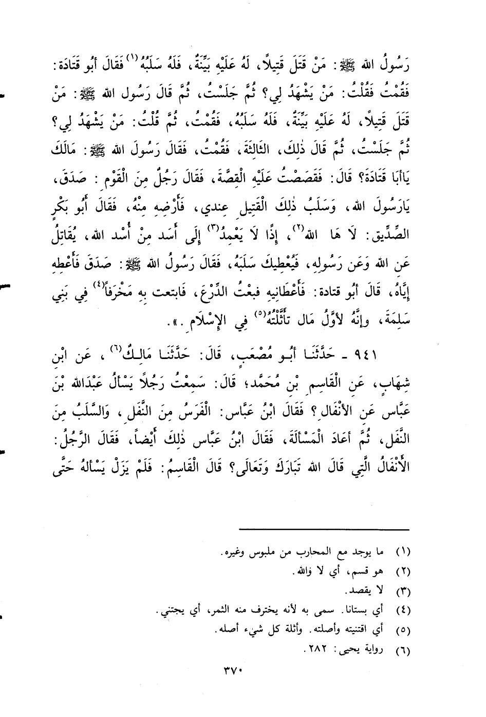 ٩٤١ - حَدَّثَنَا أَبُو مُصْعَبٍ، قَالَ: حَدَّثَنَا مَالِكٌ، عَنِ ابْنِ شِهَابٍ، عَنِ الْقَاسِمِ بْنِ مُحَمَّدٍ , قَالَ: سَمِعْتُ رَجُلاً يَسْأَلُ عَبْدَ اللهِ بْنَ عَبَّاسٍ عَنِ الأََنْفَالِ؟ فَقَالَ ابْنُ عَبَّاسٍ: الْفَرَسُ مِنَ النَّفَلِ، وَالسَّلَبُ مِنَ النَّفَلِ، قَالَ: ثُمَّ أعَادَ الِمَسْأَلَة: فَقَالَ ابْنُ عَبَّاسٍ، ذَلِكَ أَيْضًا، فقَالَ الرَّجُلُ: الأََنْفَالُ الَّتِي قَالَ اللَّهُ تبارك وتعالى؟ قَالَ الْقَاسِمُ: فَلَمْ يَزَلْ يَسْأَلُهُ حَتَّى كَادَ يُحْرِجَهُ , فَقَالَ ابْنُ عَبَّاسٍ: هل تَدْرُونَ مَا مَثَلُ هَذَا؟ مَثَلُه مَثَلُ ضبِيغٍ , الَّذِي ضَرَبَهُ عُمَرُ بْنُ الْخَطَّابِ.