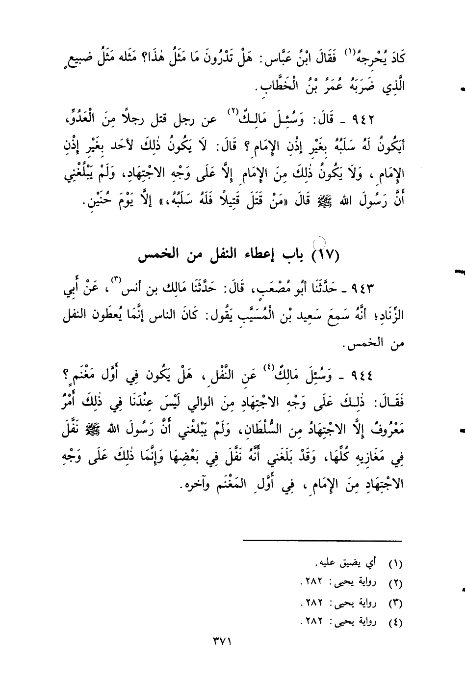 ٩٤٢ - قَالَ: وَسُئِلَ مالكٌ عَنْ رجل قَتَلَ رجلاً مِنَ الْعَدُوِّ، أَيَكُونُ لَهُ سَلَبُهُ بِغَيْرِ إِذْنِ الإِمَامِ؟ قَالَ: لَا يَكُونُ ذَلِكَ لأَحَدٍ بِغَيْرِ إِذْنِ الإِمَامِ، وَلَا يَكُونُ ذَلِكَ مِنَ الإِمَامِ إِلَاّ عَلَى وَجْهِ الاِجْتِهَادِ، وَلَمْ يَبْلُغْنِي أَنَّ رَسُولَ اللهِ صَلَّى اللَّهُ عَلَيْهِ وَسَلَّمَ قَالَ: مَنْ قَتَلَ قَتِيلاً فَلَهُ سَلَبُهُ , إِلَاّ يَوْمَ حُنَيْنٍ.