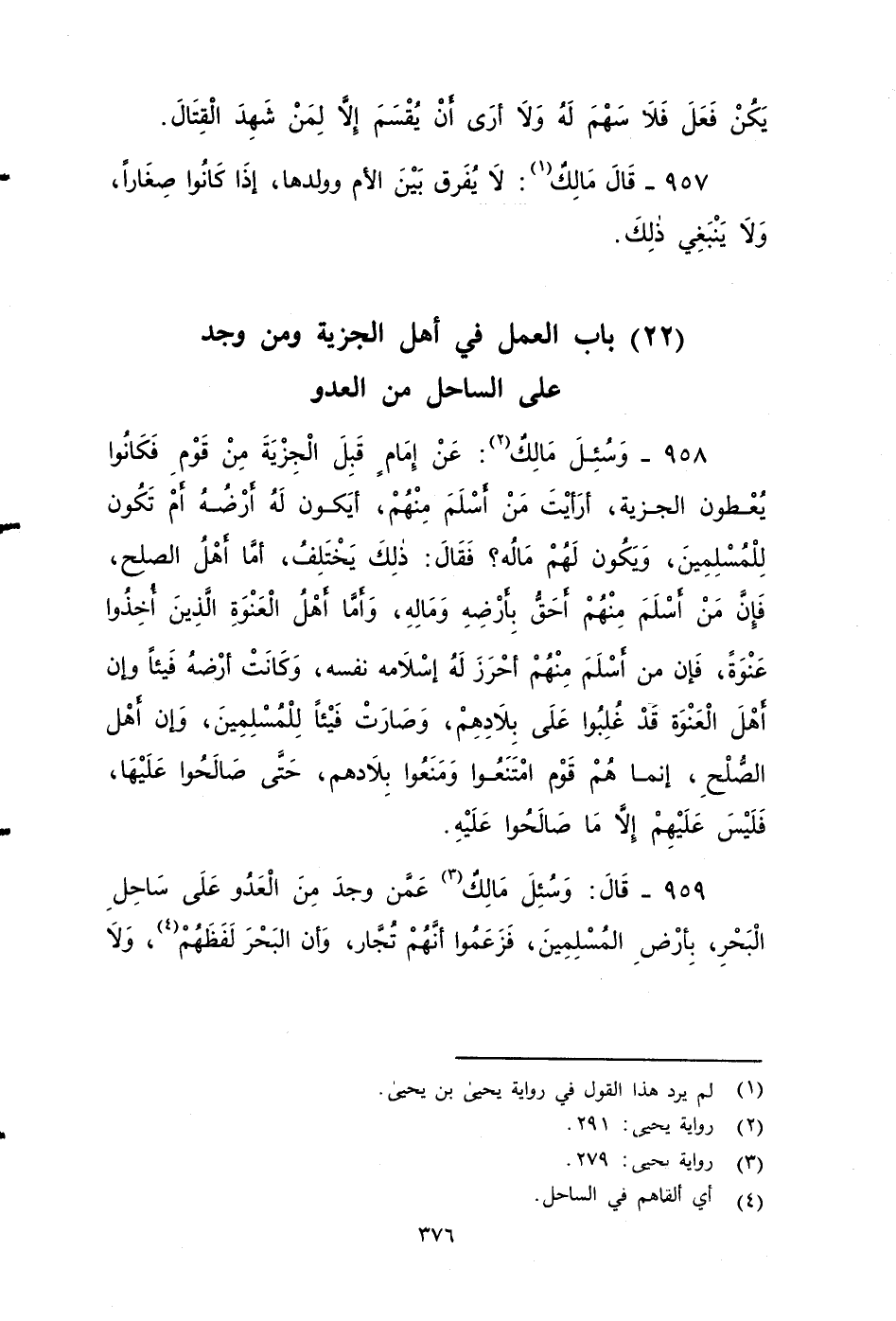 ٩٥٨ - وسُئِلَ مَالِكٌ، عَنْ إِمَامٍ قَبِلَ الْجِزْيَةَ مِنْ قَوْمٍ فَكَانُوا يُعْطُونَ الْجِزْيَةَ، أَرَأَيْتَ مَنْ أَسْلَمَ مِنْهُمْ، أَيكُونُ لَهُ أَرْضُهُ، أَم تَكُونُ لِلْمُسْلِمِينَ، وَيَكُونُ لَهُمْ مَالُهُ؟ فَقَالَ ذَلِكَ يَخْتَلِفُ، أَمَّا أَهْلُ الصُّلْحِ، فَإِنَّ مَنْ أَسْلَمَ مِنْهُمْ , أَحَقُّ بِأَرْضِهِ وَمَالِهِ، وَأَمَّا أَهْلُ الْعَنْوَةِ الَّذِينَ أُخِذُوا عَنْوَةً، فَإن مَنْ أَسْلَمَ مِنْهُمْ أحرز له إسلامه نفسه , وكانَّت أَرْضَهُ فَيْئًا، إنَّ أَهْلَ الْعَنْوَةِ قَدْ غُلِبُوا عَلَى بِلَادِهِمْ، وَصَارَتْ فَيْئًا لِلْمُسْلِمِينَ، وَإن أَهْلُ الصُّلْحِ , إِنَّما هم قَوْمٌ امَتنَعُوا ومنعوا بلادهُمْ، حَتَّى صَالَحُوا عَلَيْهَا، فَلَيْسَ عَلَيْهِمْ إِلَاّ مَا صَالَحُوا عَلَيْهِ.