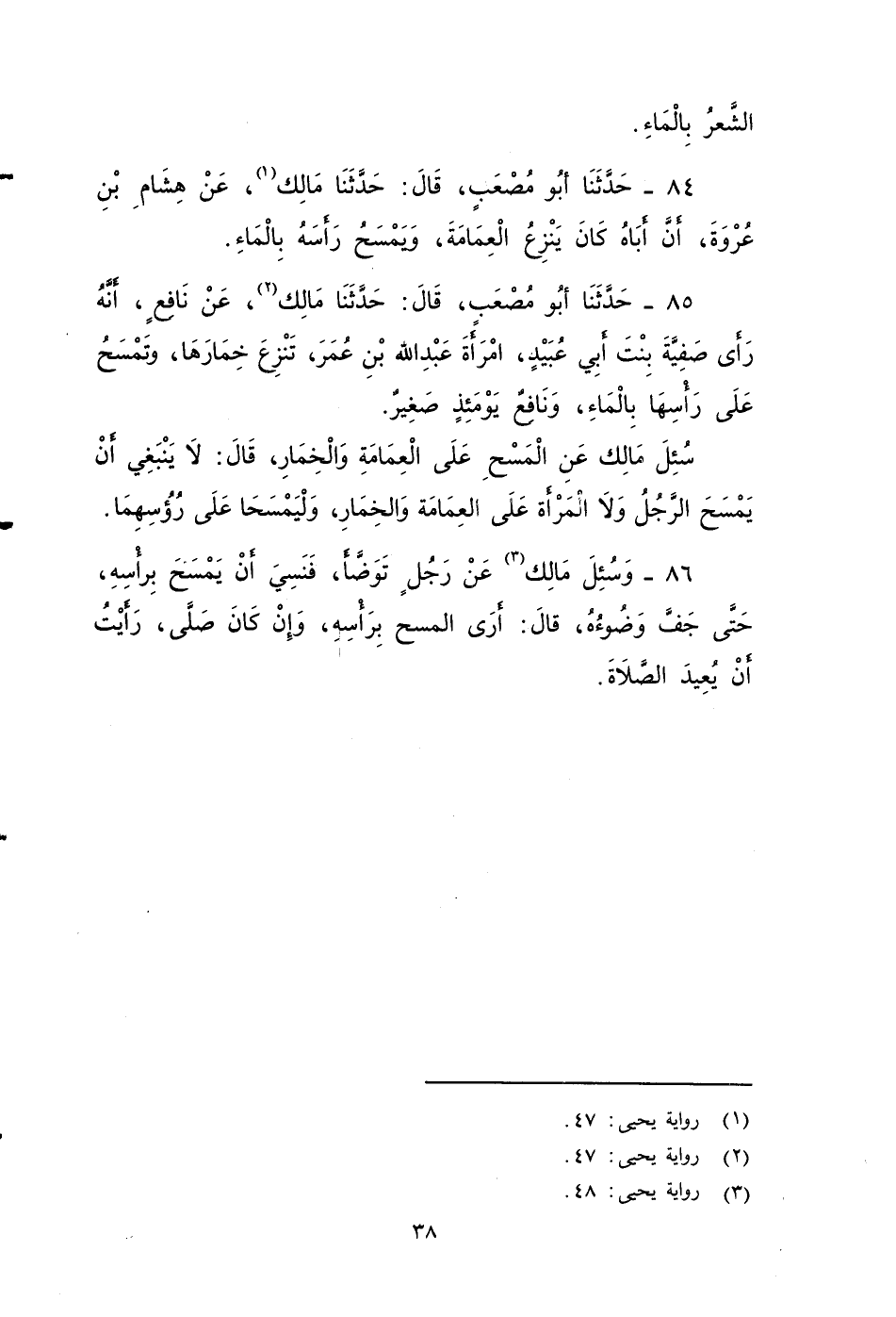 ٨٤ - حَدَّثَنَا أَبُو مُصْعَبٍ، قَالَ: حَدَّثَنَا مَالِكٌ، عَنْ هِشَامِ بْنِ عُرْوَةَ، أَنَّ أَبَاهُ كَانَ يَنْزِعُ الْعِمَامَةَ، وَيَمْسَحُ رَأْسَهُ بِالْمَاءِ.
