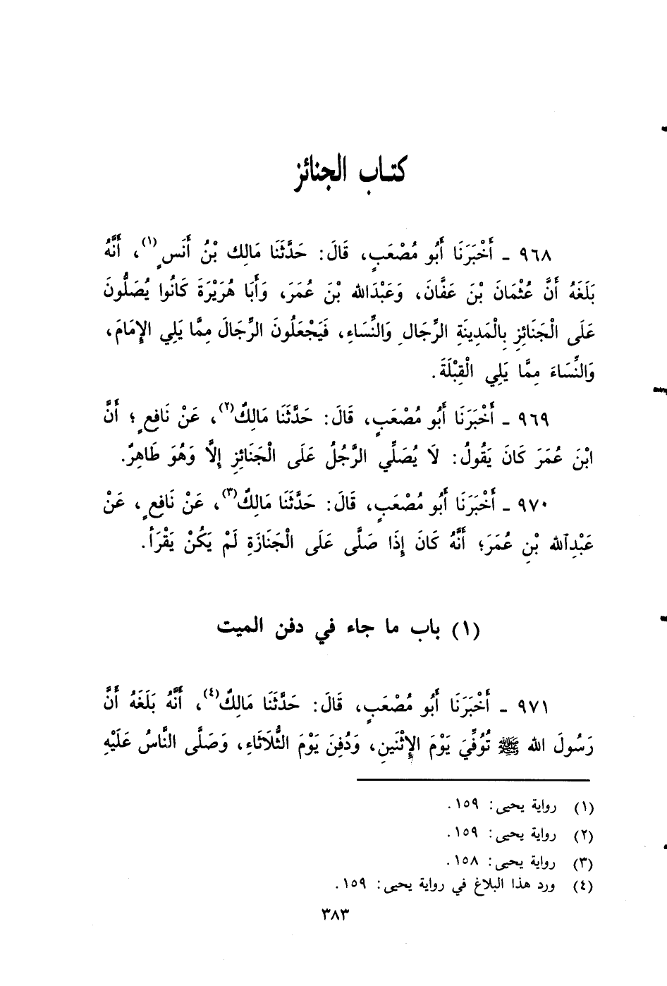 ٩٧١ - أخبرنا أَبُو مُصْعَبٍ، قَالَ: حَدَّثَنَا مَالِكٌ؛ أَنَّهُ بَلَغَهُ، أَنَّ رَسُولَ اللهِ صَلَّى اللَّهُ عَلَيْهِ وَسَلَّمَ تُوُفِّيَ يَوْمَ الإِثْنَيْنِ، وَدُفِنَ يَوْمَ الثُّلَاثَاءِ، وَصَلَّى النَّاسُ عَلَيْهِ أَفْراداً لَا يَؤُمُّهُمْ أَحَدٌ، فَقَالَ نَاسٌ: يُدْفَنُ عِنْدَ الْمِنْبَرِ، وَقَالَ آخَرُونَ: يُدْفَنُ بِالْبَقِيعِ، فَجَاءَ أَبُو بَكْرٍ الصِّدِّيقُ - رضي الله عنه -، فَقَالَ: سَمِعْتُ رَسُولَ اللهِ صَلَّى اللَّهُ عَلَيْهِ وَسَلَّمَ يَقُولُ: مَا دُفِنَ نَبِيٌّ إِلَاّ فِي مَكَانِهِ الَّذِي قبض الله نفسه فِيهِ، قال: فأخروا رَسُولَ اللهِ صَلَّى اللَّهُ عَلَيْهِ وَسَلَّمَ عن مكانه الَّذِي قبض الله نفسه فِيهِ، فَلَمَّا كَانَ عِنْدَ غُسْلِهِ، فأَرَادُوا نَزْعَ قَمِيصِهِ، فَسَمِعُوا صَوْتًا يَقُولُ: لَا تَنْزِعُوا عنه الْقَمِيصَ، وَغُسِّلَ وَهُوَ عَلَيْهِ ,.