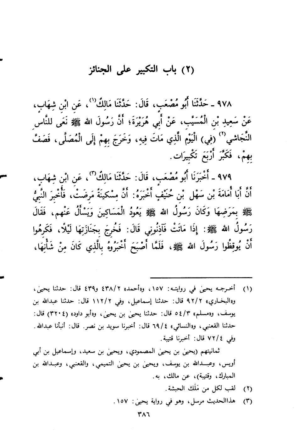 ٩٧٨ - حَدَّثَنَا أَبُو مُصْعَبٍ، قَالَ: حَدَّثَنَا مَالِكٌ، عَنِ ابْنِ شِهَابٍ، عَنْ سَعِيدِ بْنِ الْمُسَيِّبِ، عَنْ أَبِي هُرَيْرَةَ، أن رسول اللَّهِ صَلى الله عَلَيه وَسَلم نَعَى لِلنَّاسِ النَّجَاشِيَّ فِي الْيَوْمِ الَّذِي مَاتَ فِيهِ، وَخَرَجَ بِهِمْ إِلَى الْمُصَلَّى، فَصَفَّ بِهِمْ فكَبَّرَ أَرْبَعَ تَكْبِيرَاتٍ.