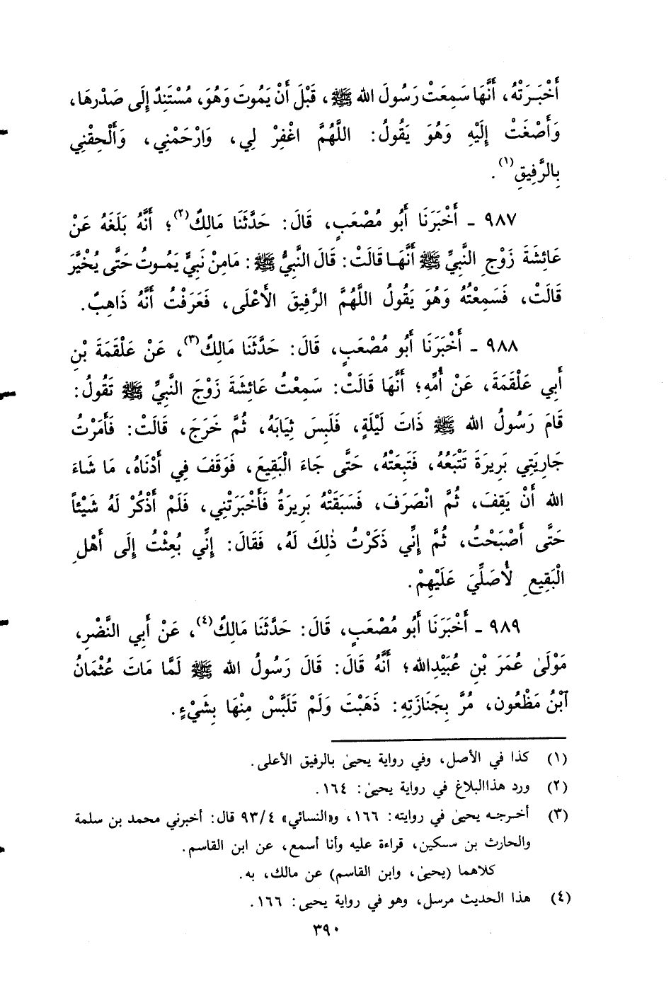 ٩٨٧ - أخبرنا أَبُو مُصْعَبٍ، قَالَ: حَدَّثَنَا مَالِكٌ؛ أَنَّهُ بَلَغَهُ، عَائِشَةَ زَوْجَ النَّبِيِّ صَلَّى اللَّهُ عَلَيْهِ وَسَلَّمَ , أَنَّها قَالَتْ: قَالَ النبي صَلَّى اللَّهُ عَلَيْهِ وَسَلَّمَ: مَا مِنْ نَبِيٍّ يَمُوتُ حَتَّى يُخَيَّرَ، قَالَتْ: فَسَمِعْتُهُ يَقُولُ: اللَّهُمَّ الرَّفِيقَ الأََعْلَى، فَعَرَفْتُ أَنَّهُ ذَاهِبٌ.