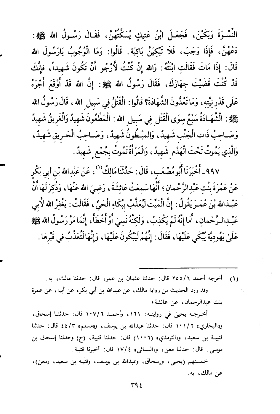٩٩٧ - أخبرنا أَبُو مُصْعَبٍ، قَالَ: حَدَّثَنَا مَالِكٌ، عَنْ عَبْدِ اللَّهِ بْنِ أَبِي بَكْرٍ، عَنْ عَمْرَةَ بِنْتِ عَبْدِ الرَّحْمَنِ، أَنَّهَا سَمِعَتْ عَائِشَةَ رَضِيَ اللَّهُ عَنْهَا: وَذُكِرَ لَهَا أَنَّ عَبْدَ اللَّهِ بْنَ عُمَرَ، يَقُولُ: إِنَّ الْمَيِّتَ لَيُعَذَّبُ بِبُكَاءِ الْحَيِّ، فَقَالَتْ: يَغْفِرُ اللَّهُ لِأَبِي عَبْدِ الرَّحْمَنِ، أَمَا إِنَّهُ لَمْ يَكْذِبْ، وَلَكِنَّهُ نَسِيَ أَوْ أَخْطَأَ، إِنَّمَا مَرَّ رَسُولُ اللَّهِ صَلى الله عَلَيه وَسَلم على يَهُودِيَّةٍ يَبْكِي عَلَيْهَا، فَقَالَ: إِنَّهمْ لَيبْكُونَ عَلَيْهَا، وَإِنَّهَا لَتُعَذَّبُ فِي قَبْرِهَا.