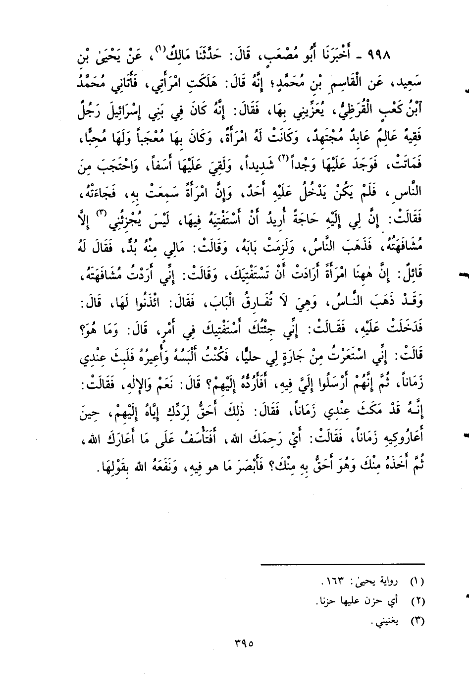 ٩٩٨ - أخبرنا أَبُو مُصْعَبٍ، قَالَ: حَدَّثَنَا مَالِكٌ، عَنْ يَحْيَى بْنِ سَعِيدٍ، عَنِ الْقَاسِمِ بْنِ مُحَمَّدٍ، إنَّهُ قَالَ: هَلَكَتِ امْرَأَتي، فَأَتَانِي مُحَمَّدُ بْنُ كَعْبٍ الْقُرَظِيُّ يُعَزِّينِي بِهَا , فَقَالَ: إِنَّهُ كَانَ فِي بَنِي إِسْرَائِيلَ رَجُلٌ فَقِيهٌ عَالِمٌ عَابِدٌ مُجْتَهِدٌ، وَكَانَتْ لَهُ امْرَأَةٌ، وَكَانَ بِهَا مُعْجَبًا , وَلَهَا مُحِبًّا، فَمَاتَتْ , فَوَجَدَ عَلَيْهَا وَجْدًا شَدِيدًا، وَلَقِيَ عَلَيْهَا أَسَفًا، وَاحْتَجَبَ مِنَ النَّاسِ، فَلَمْ يَكُنْ يَدْخُلُ عَلَيْهِ أَحَدٌ، وَإِنَّ امْرَأَةً سَمِعَتْ بِهِ , فَجَاءَتْهُ، فَقَالَتْ: إِنَّ لِي إِلَيْهِ حَاجَةً أريد أن أَسْتَفْتِيهِ فِيهَا، لَيْسَ يُجْزِئنِي إِلَاّ مُشَافَهَتُهُ، فَذَهَبَ النَّاسُ، وَلَزِمَتْ بَابَهُ، وَقَالَتْ: مَا لِي مِنْهُ بُدٌّ، فَقَالَ لَهُ قَائِلٌ: إِنَّ هَاهُنَا امْرَأَةً أَرَادَتْ أَنْ تَسْتَفْتِيَكَ، وَقَالَتْ: إِنْ أَرَدْتُ مُشَافَهَتَهُ , وَقَدْ ذَهَبَ النَّاسُ، وَهِيَ لَا تُفَارِقُ الْبَابَ، فَقَالَ: ائْذَنُوا لَهَا، قال: فَدَخَلَتْ عَلَيْهِ، فَقَالَتْ: إِنِّي جِئْتُكَ أَسْتَفْتِيكَ فِي أَمْرٍ، قَالَ: وَمَا هُوَ؟ قَالَتْ: إِنِّي اسْتَعَرْتُ مِنْ جَارَةٍ لِي حَلْيًا، فَكُنْتُ أَلْبَسُهُ وَأُعِيرُهُ فلبث عندي زَمَانًا، ثُمَّ إِنَّهُمْ أَرْسَلُوا إِلَيَّ فِيهِ، أَفَأُرده إِلَيْهِمْ؟ فَقَالَ: نَعَمْ، وَالإله، فَقَالَتْ: إِنَّهُ قَدْ مَكَثَ عِنْدِي زَمَانًا، فَقَالَ: ذَلِكَ أَحَقُّ لِرَدِّكِ إِيَّاهُ إِلَيْهِمْ، حِينَ أَعَارُوكِيهِ زَمَانًا، فَقَالَتْ: أَيْ رْحَمُكَ اللَّهُ، أَفَتَأْسَفُ عَلَى مَا أَعَارَكَ اللَّهُ، ثُمَّ أَخَذَهُ مِنْكَ وَهُوَ أَحَقُّ بِهِ مِنْكَ؟ فَأَبْصَرَ مَا هو فِيهِ , وَنَفَعَهُ اللَّهُ بِقَوْلِهَا.