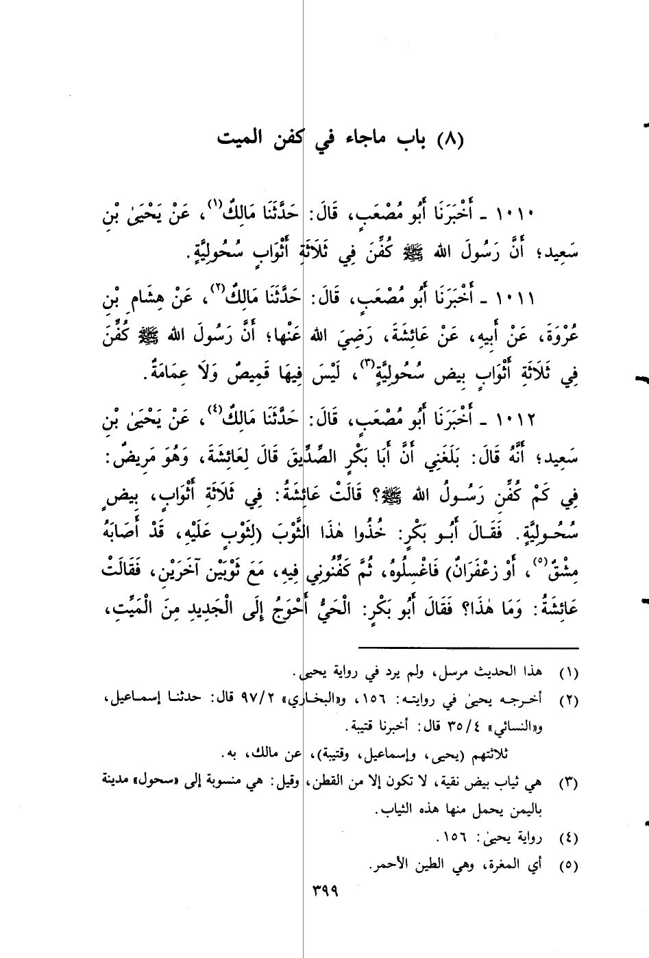 ١٠١٠ - أَخْبَرَنَا أَبُو مصعبٍ، قَالَ: حَدَّثَنَا مَالِكٌ، عَنْ يَحْيَى بْن سعيد، أَنَّ رَسُولَ اللَّهِ صَلى الله عَلَيه وَسَلم: كُفِّنَ فِي ثَلاثَةِ أَثْوَابٍ سُحُولِيَّةٍ.
