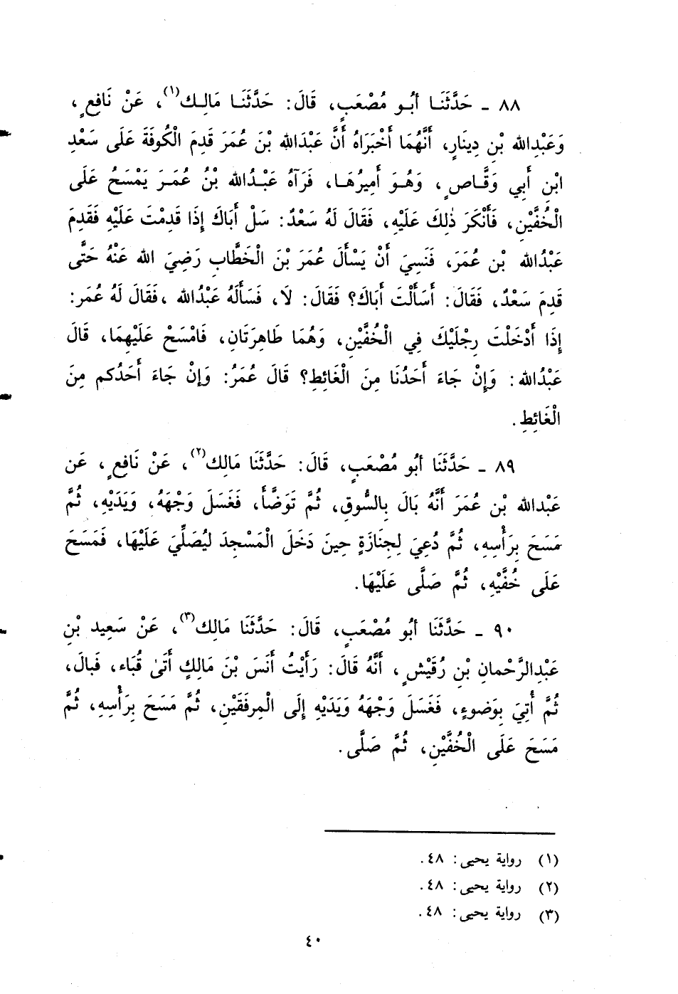 ٨٨ - حَدَّثَنَا أَبُو مُصْعَبٍ، قَالَ: حَدَّثَنَا مَالِكٌ، عَنْ نَافِعٍ، وَعَبْدِ اللهِ بْنِ دِينَارٍ، أَنَّهُمَا أَخْبَرَاهُ , أَنَّ عَبْدَ اللهِ بْنَ عُمَرَ قَدِمَ الْكُوفَةَ عَلَى سَعْدِ بْنِ أَبِي وَقَّاصٍ، وَهُوَ أَمِيرُهَا، فَرَآهُ عَبْدُ اللهِ بْنُ عُمَرَ يَمْسَحُ عَلَى الْخُفَّيْنِ، فَأَنْكَرَ ذَلِكَ عَلَيْهِ، فَقَالَ لَهُ سَعْدٌ: سَلْ أَبَاكَ إِذَا قَدِمْتَ عَلَيْهِ، فَقَدِمَ عَبْدُ اللهِ، فَنَسِيَ أَنْ يَسْأَلَ عُمَرَبن الخطاب - رضي الله عنه - حَتَّى قَدِمَ سَعْدٌ، فَقَالَ: أَسَأَلْتَ أَبَاكَ؟ فَقَالَ: لَا، فَسَأَلَهُ عَبْدُ اللهِ، فَقَالَ له عُمَرُ: إِذَا أَدْخَلْتَ رِجْلَيْكَ فِي الْخُفَّيْنِ وَهُمَا طَاهِرَتَانِ، فَامْسَحْ عَلَيْهِمَا، قَالَ عَبْدُ اللهِ: وَإِنْ جَاءَ أَحَدُنَا مِنَ الْغَائِطِ؟ قَالَ عُمَرُ: وَإِنْ جَاءَ أَحَدُكُمْ مِنَ الْغَائِطِ.