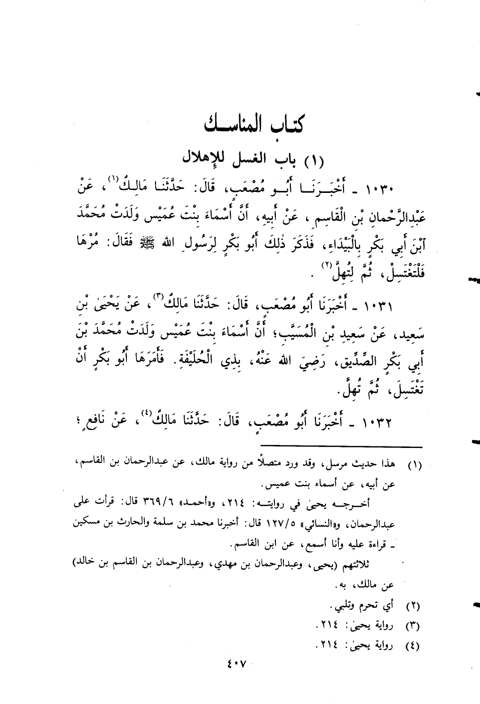 ١٠٣٠ - أخبرنا أَبُو مُصْعَبٍ، قَالَ: حَدَّثَنَا مَالِكٌ، عَنْ عَبْدِ الرَّحْمَنِ بْنِ الْقَاسِمِ، عَنْ أَبِيهِ، أن أَسْمَاءَ بِنْتَ عُمَيْسٍ وَلَدَتْ مُحَمَّدَ بْنَ أَبِي بَكْرٍ بِالْبَيْدَاءِ، فَذَكَرَ ذَلِكَ أَبُو بَكْرٍ لِرَسُولِ اللَّهِ صَلى الله عَلَيه وَسَلم، فَقَالَ: مُرْهَا فَلْتَغْتَسِلْ، ثُمَّ لِتُهِلَّ.
