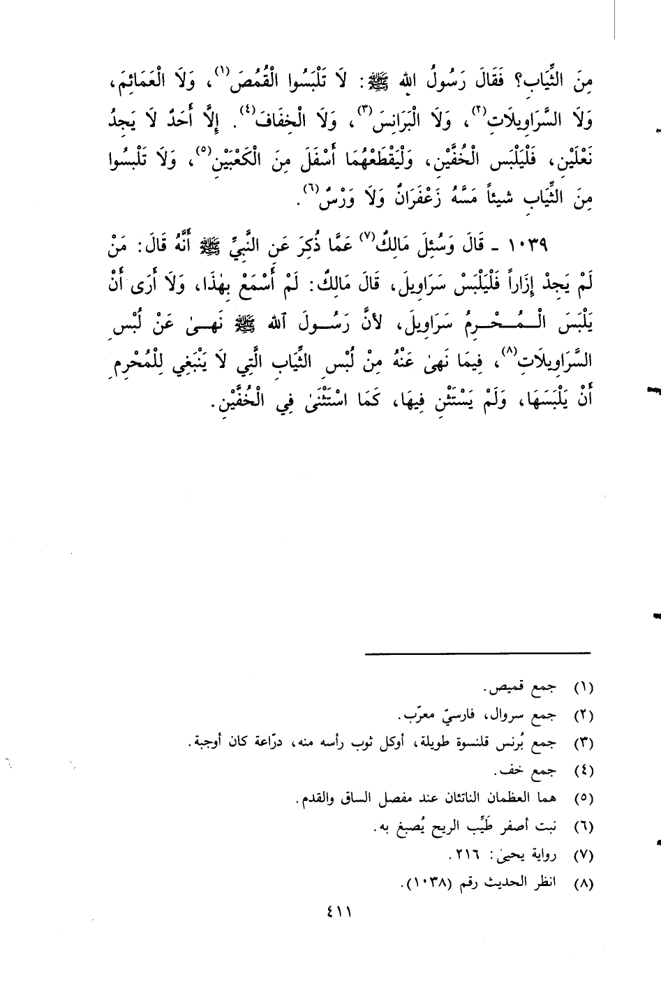 ١٠٣٩ - قال: وَسُئِلَ مَالِكٌ عَمَّا ذُكِرَ عَنِ النَّبِيِّ صَلَّى اللَّهُ عَلَيْهِ وَسَلَّمَ أَنَّهُ قَالَ: وَمَنْ لَمْ يَجِدْ إِزَارًا , فَلْيَلْبَسْ سَرَاوِيلَ، قَالَ مالك: لَمْ أَسْمَعْ بِهَذَا، وَلَا أَرَى أَنْ يَلْبَسَ الْمُحْرِمُ سَرَاوِيلَ , لأَنَّ رسول الله صَلَّى اللَّهُ عَلَيْهِ وَسَلَّمَ نَهَى عَنْ لُبْسِ السَّرَاوِيلَاتِ، فِيمَا نَهَى عَنْهُ مِنْ لُبْسِ الثِّيَابِ الَّتِي لَا يَنْبَغِي لِلْمُحْرِمِ أَنْ يَلْبَسَهَا، وَلَمْ يَسْتَثْنِ فِيهَا كَمَا اسْتَثْنَى فِي الْخُفَّيْنِ.