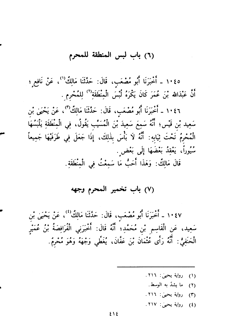 ١٠٤٦ - أخبرنا أَبُو مُصْعَبٍ، قَالَ: حَدَّثَنَا مَالِكٌ، عَنْ يَحْيَى بْنِ سَعِيدٍ بن قيس , أَنَّهُ سَمِعَ سَعِيدَ بْنَ الْمُسَيَّبِ يَقُولُ فِي الْمِنْطَقَةِ يَلْبَسُهَا الْمُحْرِمُ تَحْتَ ثِيَابِهِ: أَنَّهُ لَا بَأْسَ بِذَلِكَ إِذَا جَعَلَ فِي طَرَفَيْهَا جَمِيعًا سُيُورًا يَعْقِدُ بَعْضَهَا إِلَى بَعْضٍ.