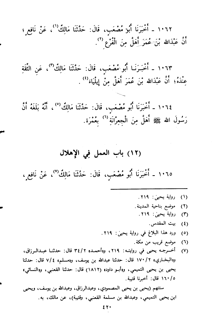 ١٠٦٣ - أخبرنا أَبُو مُصْعَبٍ، قَالَ: حَدَّثَنَا مَالِكٌ , عَنِ الثِّقَةِ عِنْدَهُ، أَنَّ عَبْدَ اللهِ بْنَ عُمَرَ أَهَلَّ مِنْ إِيلِيَاءَ.