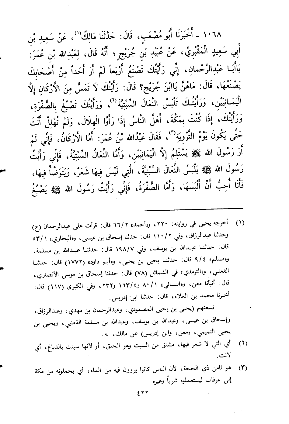 ١٠٦٨ - أخبرنا أَبُو مُصْعَبٍ، قَالَ: حَدَّثَنَا مَالِكٌ، عَنْ سَعِيدِ بْنِ أَبِي سَعِيدٍ الْمَقْبُرِيِّ، عَنْ عُبَيْدِ بْنِ جُرَيْجٍ، أَنَّهُ قَالَ لِعَبْدِ اللَّهِ بْنِ عُمَرَ: يَا أَبَا عَبْدِ الرَّحْمَنِ: أني رَأَيْتُكَ تَصْنَعُ أَرْبَعًا لَمْ أَرَ أَحَدًا مِنْ أَصْحَابِكَ يَصْنَعُهَا قَالَ: مَا هُنَّ يَا ابْنَ جُرَيْجٍ؟ قَالَ: رَأَيْتُكَ لا تَمَسُّ مِنَ الأَرْكَانِ إِلَّا الْيَمَانِيَّيْنِ، وَرَأَيْتُكَ تَلْبَسُ النِّعَالَ السِّبْتِيَّةَ، وَرَأَيْتُكَ تَصْبُغُ بِالصُّفْرَةِ، وَرَأَيْتُكَ إِذَا كُنْتَ بِمَكَّةَ: أَهَلَّ النَّاسُ إِذَا رَأَوُا الْهِلَالَ، وَلَمْ تُهْلِلْ أَنْتَ حَتَّى يَكُونَ يَوْمُ التَّرْوِيَةِ، فَقَالَ عَبْدُ اللَّهِ بْنُ عُمَرَ: أَمَّا الأَرْكَانُ: فَإِنِّي لَمْ أَرَ رَسُولَ اللَّهِ صَلى الله عَلَيه وَسَلم يَمَسُّ إِلَّا الْيَمَانِيَّيْنِ، وَأَمَّا النِّعَالُ السِّبْتِيَّةُ: فَإِنِّي رَأَيْتُ رَسُولَ اللَّهِ صَلى الله عَلَيه وَسَلم يَلْبَسُ النِّعَالَ السبتية الَّتِي لَيْسَ فِيهَا شَعَرٌ، وَيَتَوَضَّأُ فِيهَا، فَأَنَا أُحِبُّ أَنْ أَلْبَسَهَا، وَأَمَّا الصُّفْرَةُ، فَإِنِّي رَأَيْتُ رَسُولَ اللَّهِ صَلى الله عَلَيه وَسَلم يَصْبُغُ بِهَا، وأَنَا أُحِبُّ أَنْ أَصْبُغَ بِهَا، وَأَمَّا الْإِهْلَالُ: فَإِنِّي لَمْ أَرَ رَسُولَ اللَّهِ صَلى الله عَلَيه وَسَلم يُهِلُّ حَتَّى تَنْبَعِثَ بِهِ رَاحِلَتُهُ.