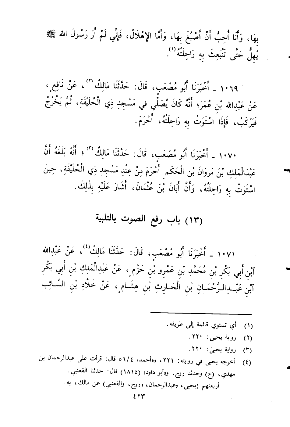 ١٠٦٩ - أخبرنا أَبُو مُصْعَبٍ، قَالَ: حَدَّثَنَا مَالِكٌ، عَنْ نَافِعٍ، عن عَبْدَ اللهِ بْنَ عُمَرَ أنه كَانَ يُصَلِّي فِي مَسْجِدِ ذِي الْحُلَيْفَةِ، ثُمَّ يَخْرُجُ فَيَرْكَبُ، فَإِذَا اسْتَوَتْ بِهِ رَاحِلَتُهُ أَحْرَمَ