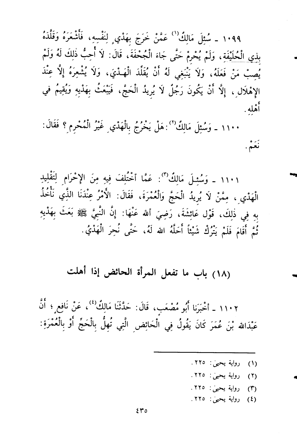 ١١٠٢ - أخبرنا أَبُو مُصْعَبٍ، قَالَ: حَدَّثَنَا مَالِكٌ، عَنْ نَافِعٍ، أَنَّ عَبْدَ اللهِ بْنَ عُمَرَ كَانَ يَقُولُ في الْحَائِضُ الَّتِي تُهِلُّ بِالْحَجِّ أَوِ الْعُمْرَةِ، إِنَّهَا تُهِلُّ بِحَجِّهَا أَوْ بعُمْرَتِهَا إِذَا أَرَادَتْ، وَلَكِنْ لَا تَطُوفُ بِالْبَيْتِ، وَلَا بَيْنَ الصَّفَا وَالْمَرْوَةِ، وَهِيَ تَشْهَدُ الْمَنَاسِكَ كُلَّهَا مَعَ النَّاسِ، غَيْرَ أَنَّهَا لَا تَطُوفُ بِالْبَيْتِ، وَلَا بَيْنَ الصَّفَا وَالْمَرْوَةِ , وَلَا تَقْرَبُ الْمَسْجِدَ حَتَّى تَطْهُرَ.