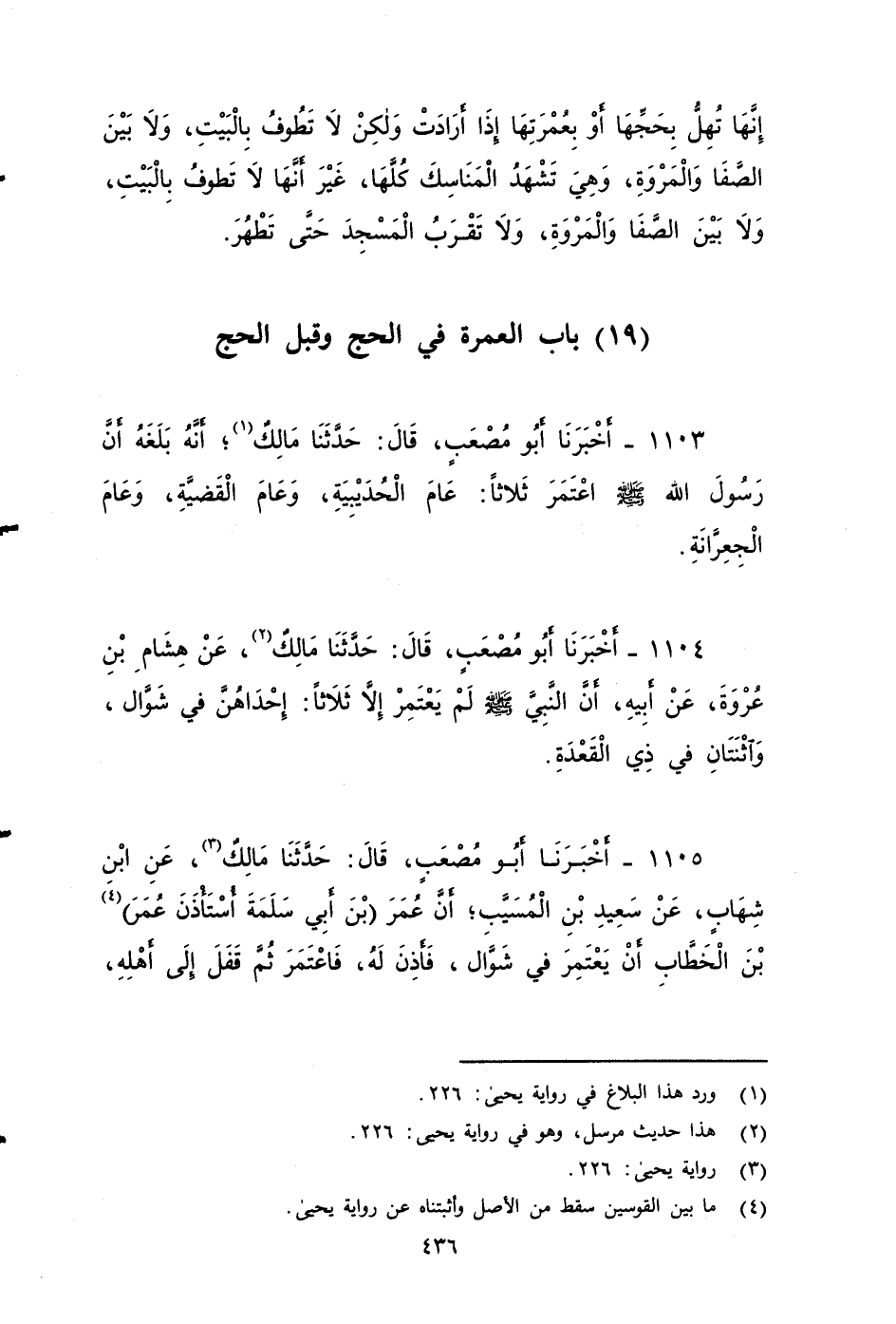 ١١٠٤ - أخبرنا أَبُو مُصْعَبٍ، قَالَ: حَدَّثَنَا مَالِكٌ، عَنْ هِشَامِ بْنِ عُرْوَةَ، عَنْ أَبِيهِ، أَنَّ النَّبِيَّ صَلى الله عَلَيه وَسَلم: لَمْ يَعْتَمِرْ إِلَّا ثَلَاثًا إِحْدَاهُنَّ فِي شَوَّالٍ، وَاثْنَتَانِ فِي ذِي الْقَعْدَةِ.