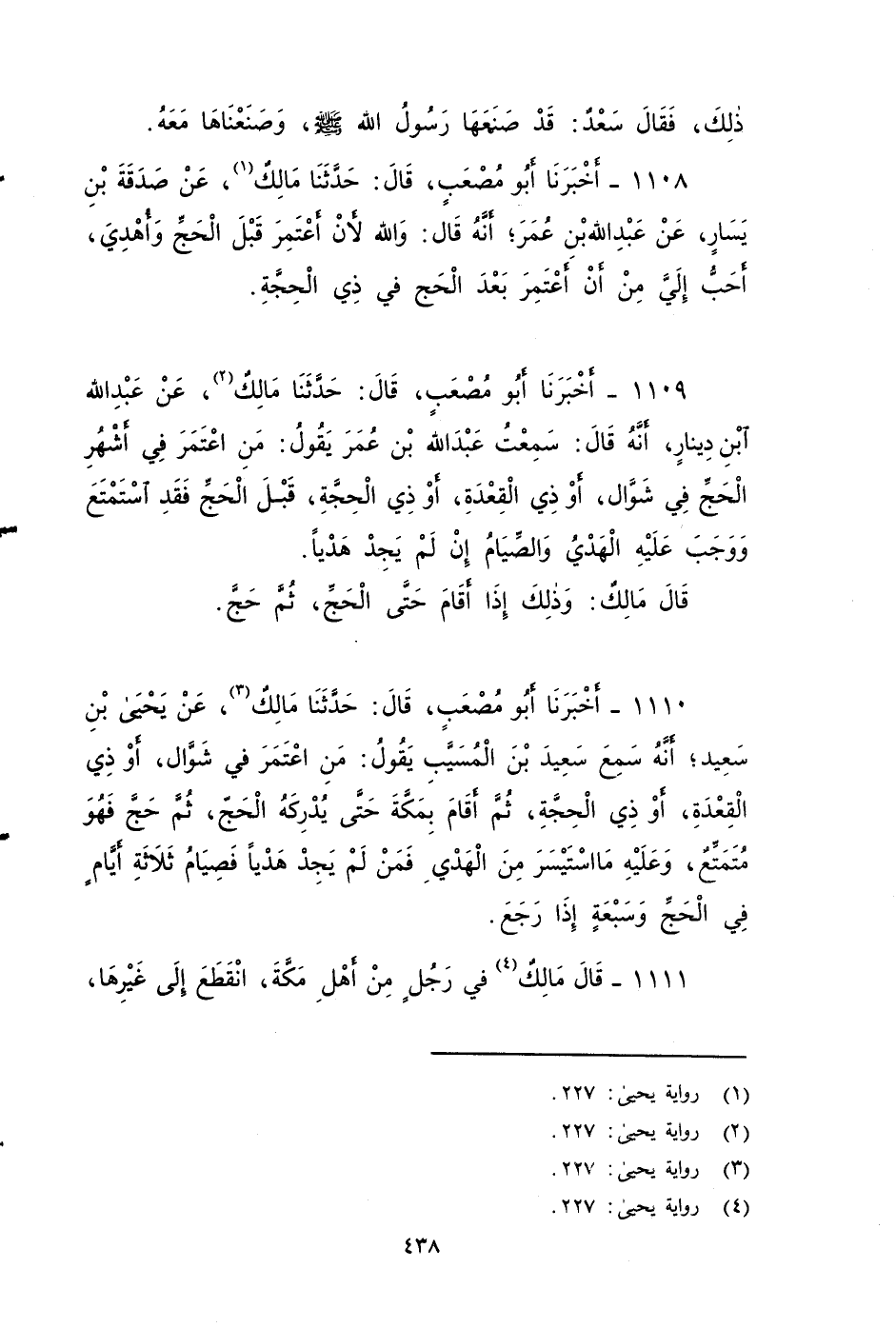 ١١٠٩ - أخبرنا أَبُو مُصْعَبٍ، قَالَ: حَدَّثَنَا مَالِكٌ، عَنْ عَبْدِ اللهِ بْنِ دِينَارٍ أنه قال: سمعت عَبْدِ اللهِ بْنِ عُمَرَ يَقُولُ: مَنِ اعْتَمَرَ فِي أَشْهُرِ الْحَجِّ فِي شَوَّالٍ، أَوْ ذِي الْقَعْدَةِ، أَوْ ذِي الْحِجَّةِ، قَبْلَ الْحَجِّ، فَقد إستمَتِّعٌ وَوجب عَلَيْهِ الْهَدْيِ والصِيَامُ إِنْ لَمْ يَجِدْ هدياً.