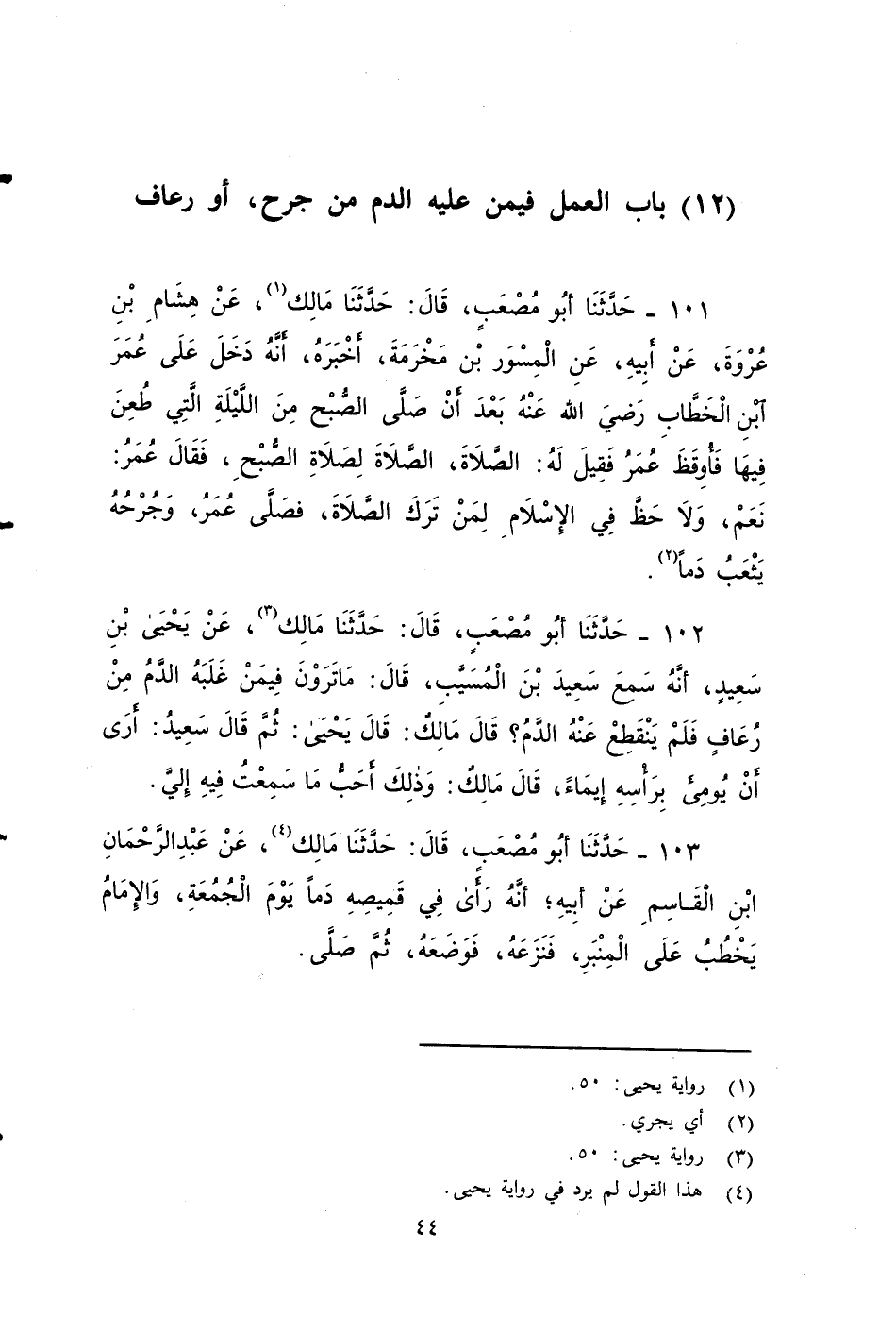 ١٠١ - حَدَّثَنَا أَبُو مُصْعَبٍ، قَالَ: حَدَّثَنَا مَالِكٌ، عَنْ هِشَامِ بْنِ عُرْوَةَ , عَنْ أَبِيهِ، عن الْمِسْوَرَ بْنَ مَخْرَمَةَ أَخْبَرَهُ، أَنَّهُ دَخَلَ عَلَى عُمَرَ بْنِ الْخَطَّابِ - رضي الله عنه - بعد أن صلى الصُّبْحِ مِنَ اللَّيْلَةِ الَّتِي طُعِنَ فِيهَا، فَأَوقَظَ عُمَرَفقيل له الِصَلَاةِ، الصلاة لصلاة الصبح فَقَالَ عُمَرُ: نَعَمْ، وَلَا حَظَّ فِي الإِسْلَامِ لِمَنْ تَرَكَ الصَّلَاةَ، فَصَلَّى عُمَرُ، وَجُرْحُهُ يَثْعَبُ دَمًا.