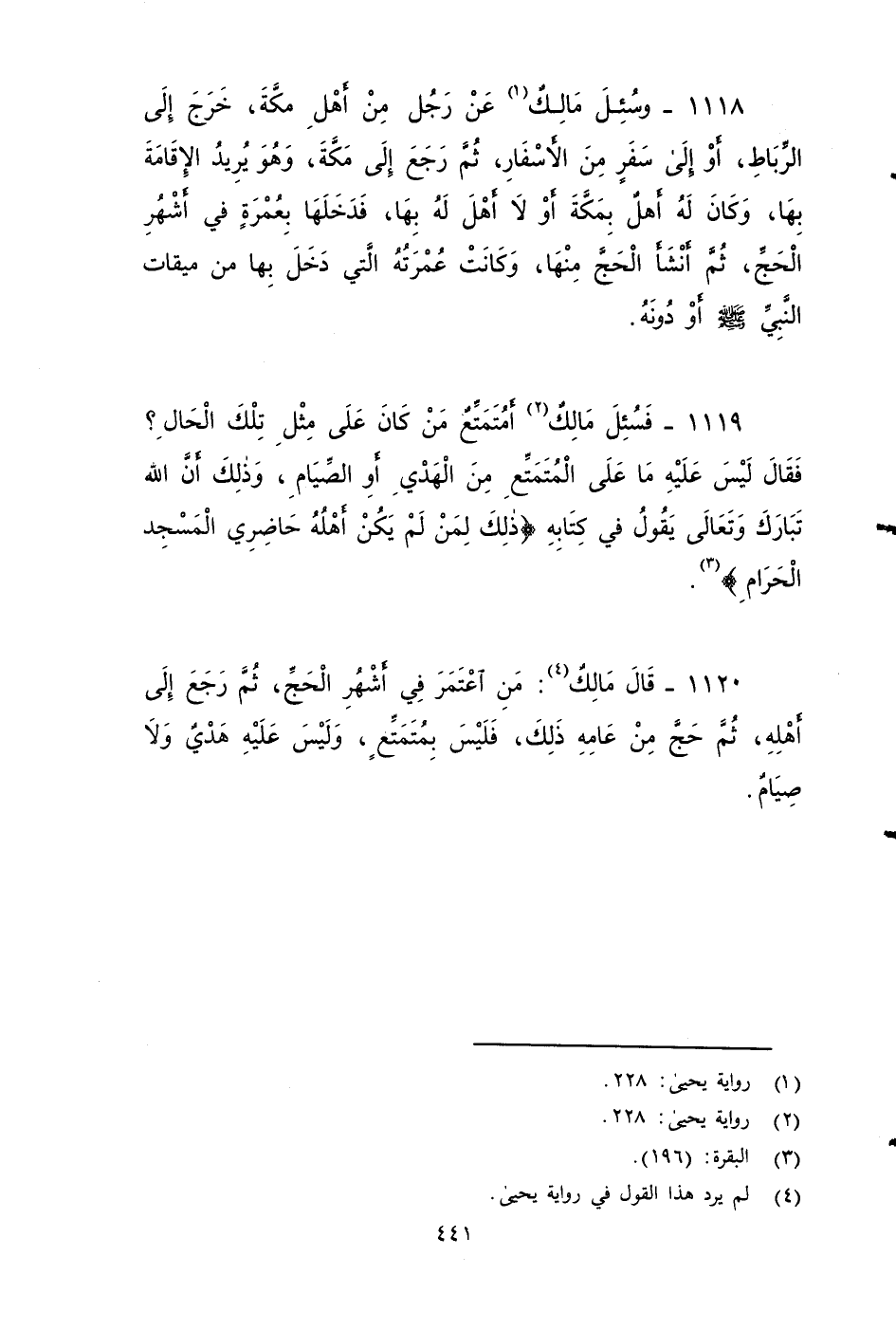 ١١١٨ - وسُئِلَ مَالِكٌ عَنْ رَجُلٍ مِنْ أَهْلِ مَكَّةَ , خَرَجَ إِلَى الرِّبَاطِ أَوْ إِلَى سَفَرٍ مِنَ الأََسْفَارِ، ثُمَّ رَجَعَ إِلَى مَكَّةَ، وَهُوَ يُرِيدُ الإِقَامَةَ بِهَا، وكَانَ لَهُ أَهْلٌ بِمَكَّةَ أَوْ لَا أَهْلَ لَهُ بِهَا، فَدَخَلَهَا بِعُمْرَةٍ فِي أَشْهُرِ الْحَجِّ، ثُمَّ أَنْشَأَ الْحَجَّ منها، وَكَانَتْ عُمْرَتُهُ الَّتِي دَخَلَ بِهَا مِنْ مِيقَاتِ النَّبِيِّ صَلَّى اللَّهُ عَلَيْهِ وَسَلَّمَ أَوْ دُونَهُ.