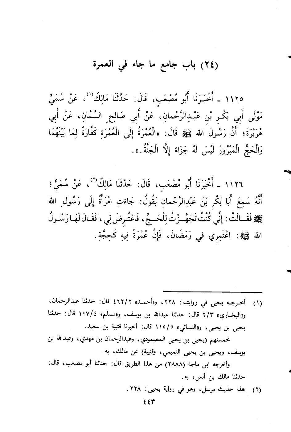 ١١٢٥ - أخبرنا أَبُو مُصْعَبٍ، قَالَ: حَدَّثَنَا مَالِكٌ، عَنْ سُمَيٍّ مَوْلَى أَبِي بَكْرِ بْنِ عَبْدِ الرَّحْمَنِ، عَنْ أَبِي صَالِحٍ السَّمَّانِ، عَنْ أَبِي هُرَيْرَةَ، أَنَّ رَسُولَ اللَّهِ صَلى الله عَلَيه وَسَلم، قَالَ: الْعُمْرَةُ إِلَى الْعُمْرَةِ كَفَّارَةٌ لِمَا بَيْنَهُمَا، وَالْحَجُّ الْمَبْرُورُ لَيْسَ لَهُ جَزَاءٌ إِلَّا الْجَنَّةُ.