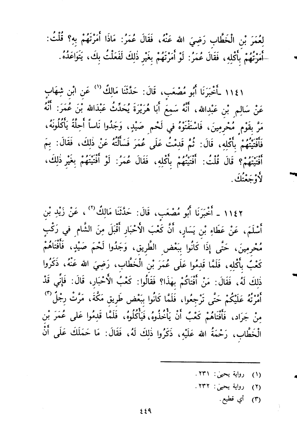 ١١٤٢ - أخبرنا أَبُو مُصْعَبٍ، قَالَ: حَدَّثَنَا مَالِكٌ، عَنْ زَيْدِ بْنِ أَسْلَمَ، عَنْ عَطَاءِ بْنِ يَسَارٍ، أَنَّ كَعْبَ الأََحْبَارِ أَقْبَلَ مِنَ الشَّامِ فِي رَكْبٍ، حَتَّى إِذَا كَانُوا بِبَعْضِ الطَّرِيقِ، وَجَدُوا لَحْمَ صَيْدٍ، فَأَفْتَاهُمْ كَعْبٌ بِأَكْلِهِ، قَالَ: فَلَمَّا قَدِمُوا عَلَى عُمَرَ بْنِ الْخَطَّابِ - رضي الله عنه - , ذَكَرُوا ذَلِكَ لَهُ، فَقَالَ: مَنْ أَفْتَاكُمْ بِهَذَا؟ فقَالُوا: كَعْبٌ لأََحْبَارِ، قَالَ: فَإِنِّي قَدْ أَمَّرْتُهُ عَلَيْكُمْ حَتَّى تَرْجِعُوا، فلَمَّا كَانُوا بِبَعْضِ طَرِيقِ مَكَّةَ , مَرَّتْ رِجْلٌ مِنْ جَرَادٍ، فَأَفْتَاهُمْ كَعْبٌ أَنْ يَأْخُذُوهُ، فَيَأْكُلُوهُ، فَلَمَّا قَدِمُوا عَلَى عُمَرَ بْنِ الْخَطَّابِ - رحمة الله عليه - ذَكَرُوا ذَلِكَ لَهُ، فَقَالَ: مَا حَمَلَكَ أَنْ أَفْتَيْتَهُمْ بِهَذَا؟ قَالَ: هُوَ مِنْ صَيْدِ الْبَحْرِ، قَالَ: وَمَا يُدْرِيكَ؟ قَالَ: يَا أَمِيرَ الْمُؤْمِنِينَ، وَالَّذِي نَفْسِي بِيَدِهِ، إِنْ هِو إِلَاّ نَثْرَةُ حُوتٍ يَنْثُرُهُ فِي كُلِّ عَامٍ مَرَّتَيْنِ ...