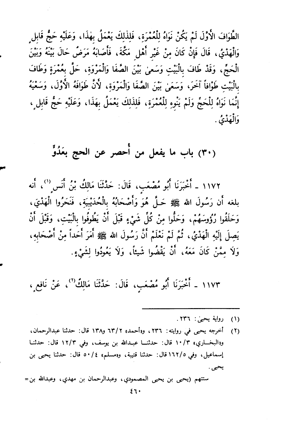 ١١٧٢ - أخبرنا أَبُو مُصْعَبٍ، قَالَ: حَدَّثَنَا مَالِكٌ بن أنس؛ أَنَّهُ بَلَغَهُ، أَنَّ رَسُولَ اللهِ صَلَّى اللَّهُ عَلَيْهِ وَسَلَّمَ حَلَّ هُوَ وَأَصْحَابُهُ بِالْحُدَيْبِيَةِ، فَنَحَرُوا الْهَدْيَ، وَحَلَقُوا رُؤُوسَهُمْ، وَحَلُّوا مِنْ كُلِّ شَيْءٍ قَبْلَ أَنْ يَطُوفُوا بِالْبَيْتِ، وَقَبْلَ أَنْ يَصِلَ إِلَيْهِ الْهَدْيُ , ثُمَّ لَمْ نعْلَمْ أَنَّ رَسُولَ اللهِ صَلَّى اللَّهُ عَلَيْهِ وَسَلَّمَ أَمَرَ أَحَدًا مِنْ أَصْحَابِهِ، وَلَا مِمَّنْ كَانَ مَعَهُ، أَنْ يَقْضُوا شَيْئًا، وَلَا يَعُودُوا لِشَيْءٍ ...